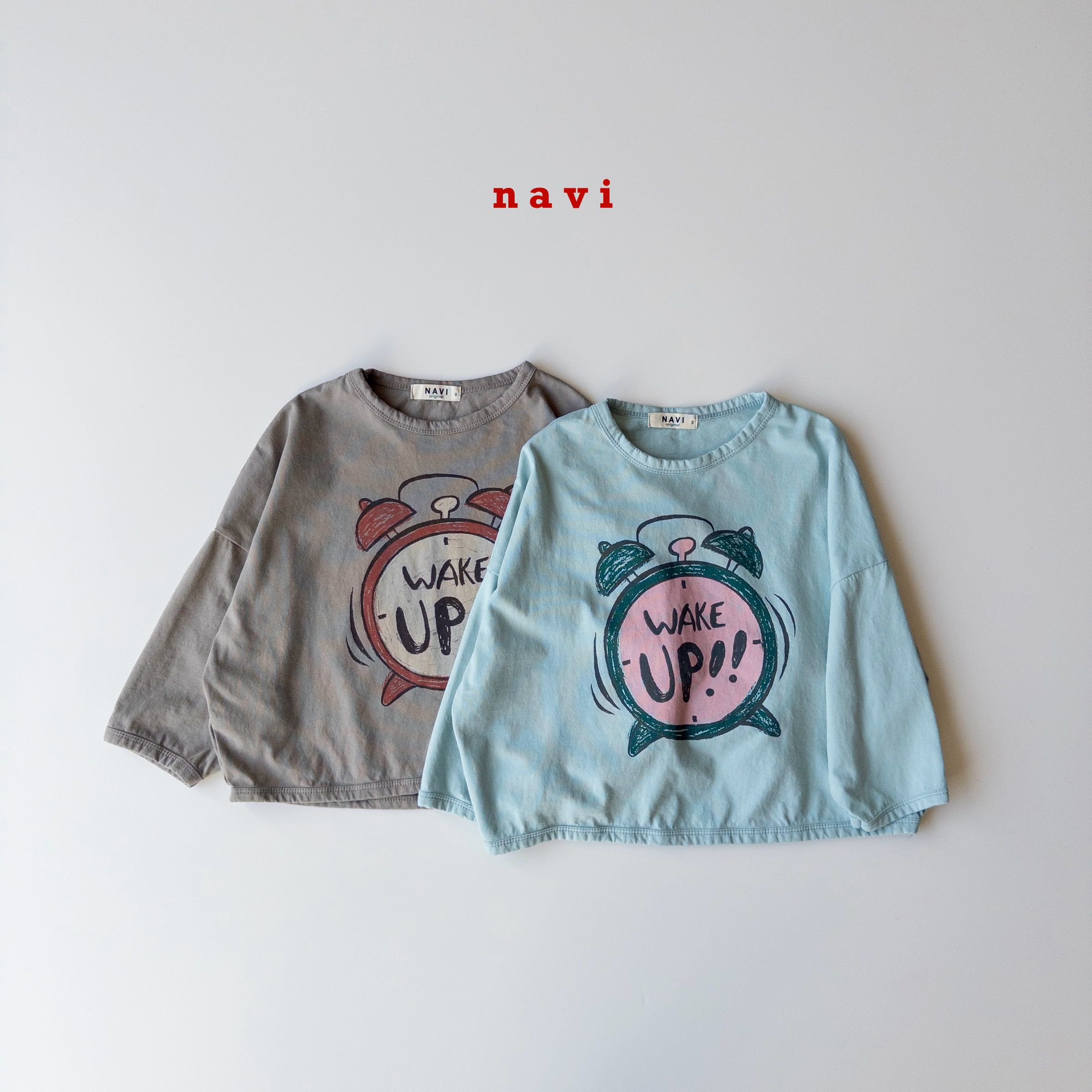 韓國 THE NAVi - 塗鴉鬧鐘純棉落肩長袖上衣-天藍