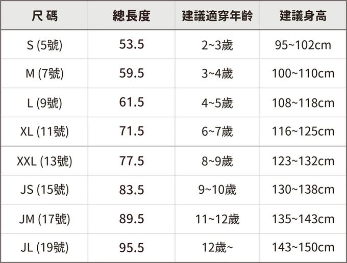 1. 尺寸表單位皆為公分(cm),實際尺寸會因布料彈性、水洗、測量起迄點等因素略有誤差。建議參考孩子平時穿著衣物尺寸進行選購。