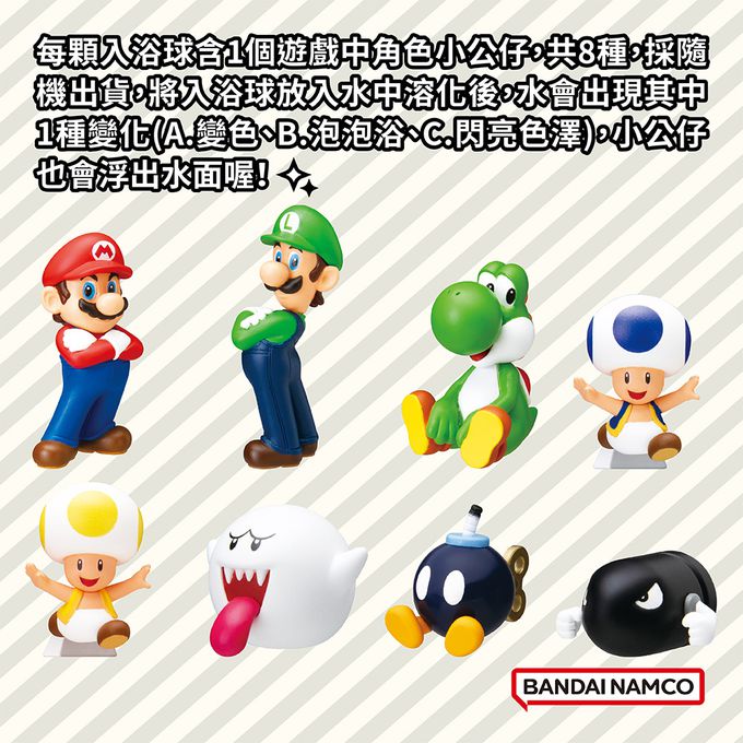 任天堂Switch電玩《超級瑪利歐兄弟驚奇》主題入浴球,在浴缸中重現遊戲中得到驚奇花後的場景,水會變色? 泡泡浴? 閃亮色澤? 會出現哪種變化呢? 共8種遊戲裡角色小公仔,全部收集排列起來,樂趣無窮!!