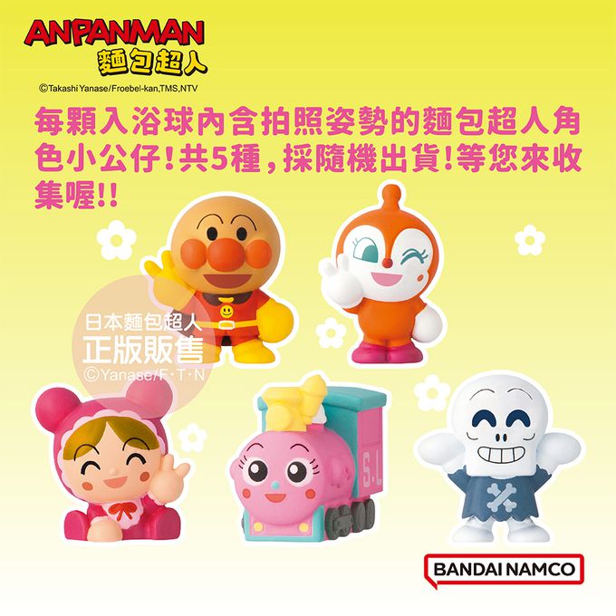 入浴球本身共有3種不同角色的大頭造型(麵包超人/細菌人/紅精靈),採隨機出貨。