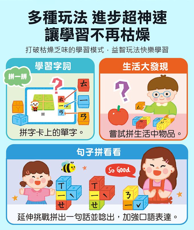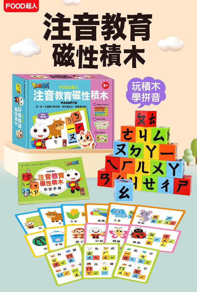 注意事項:內容物:20顆注音積木、1本說明手冊、15張學習卡片。