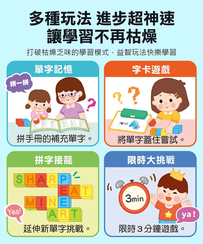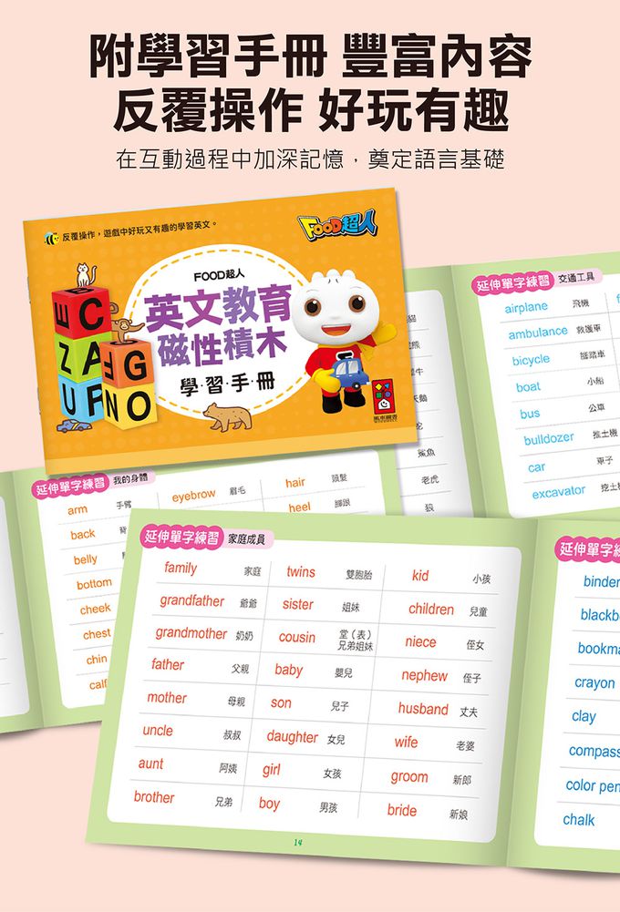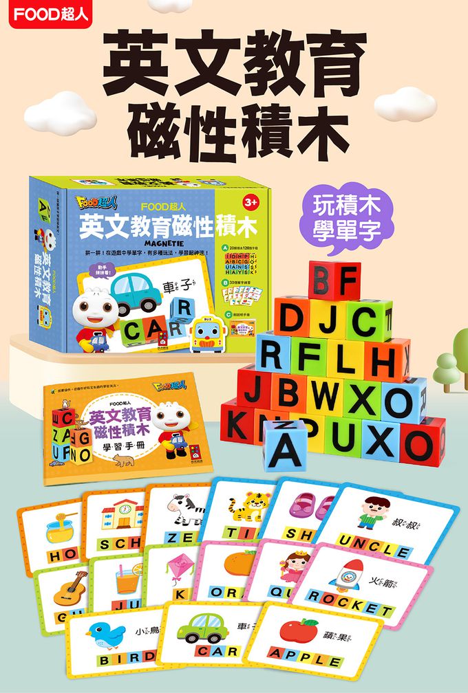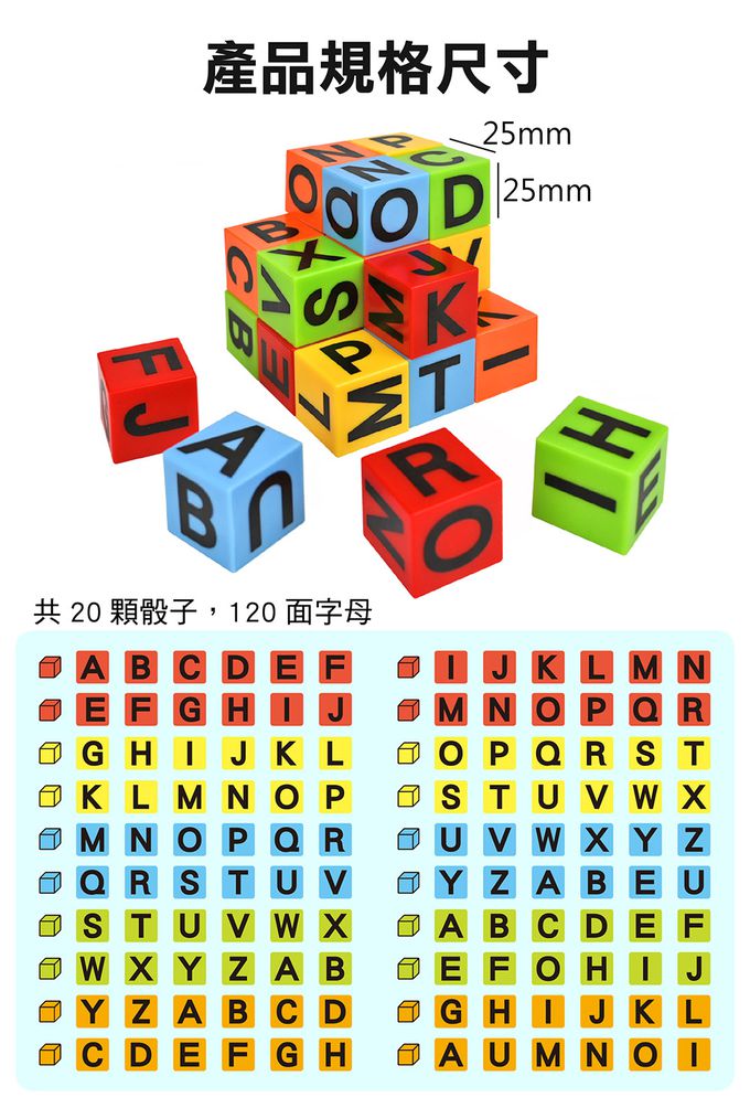 注意事項:內容物:20顆注音積木、1本說明手冊、15張學習卡片。