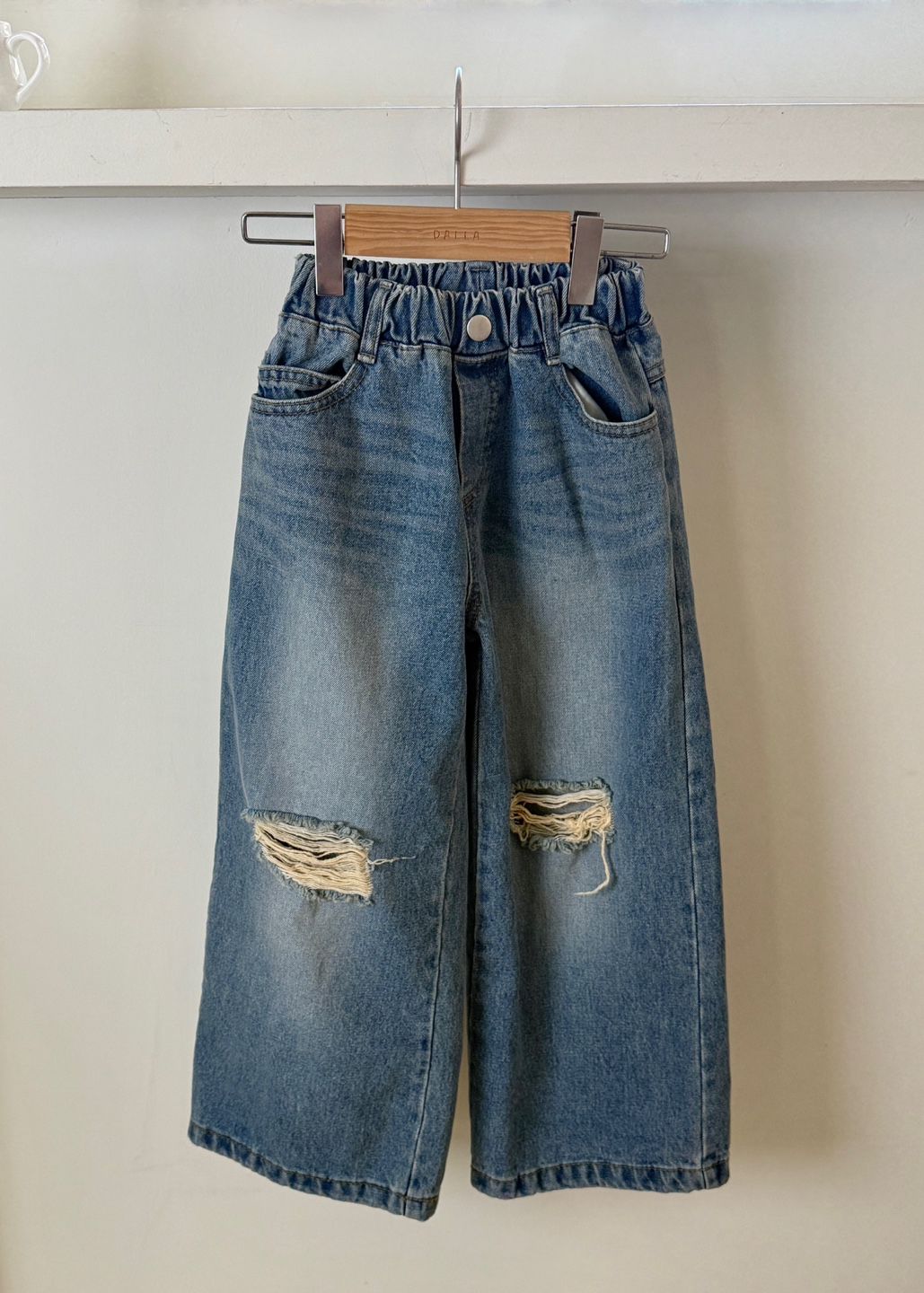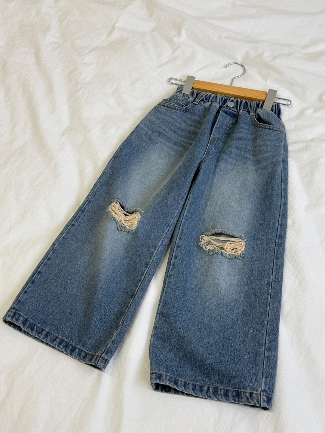 韓國 sm2 - 鬆緊腰膝蓋刷破感牛仔長褲