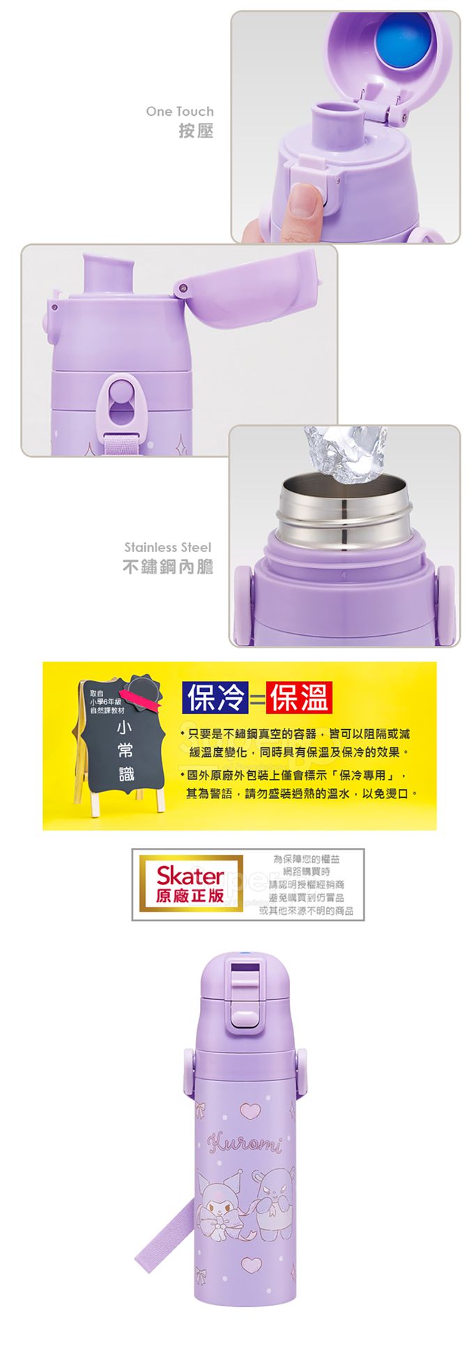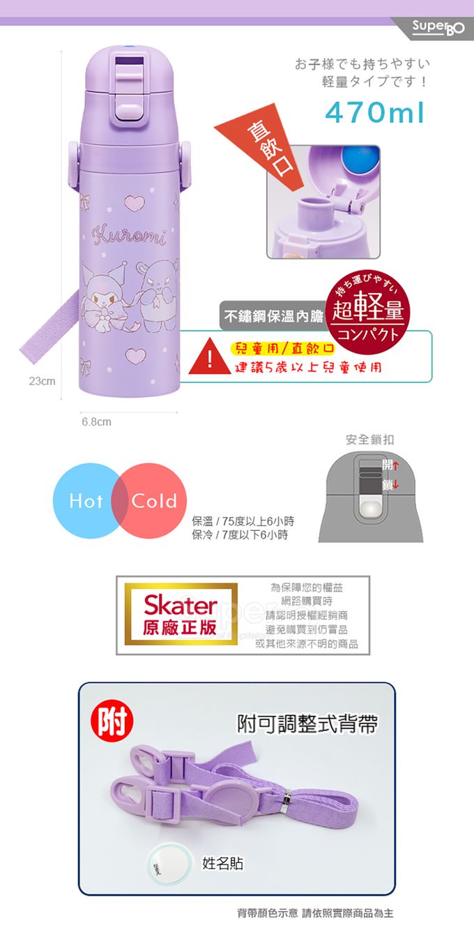 注意事項:● 雙層真空不鏽鋼容器,皆具有保冷保溫功能,為避免燙口,燙傷或其他不當使用等意外,故包裝僅標示 保冷專用。 ● 此為『直飲式水壺』,不適合5歲以下幼童使用,請評估有能力使用再購買。