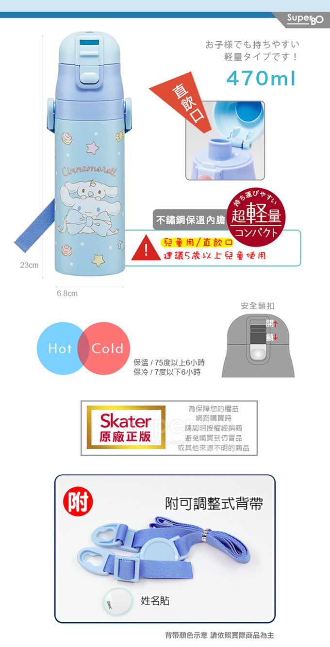 注意事項:● 雙層真空不鏽鋼容器,皆具有保冷保溫功能,為避免燙口,燙傷或其他不當使用等意外,故包裝僅標示 保冷專用。 ● 此為『直飲式水壺』,不適合5歲以下幼童使用,請評估有能力使用再購買。