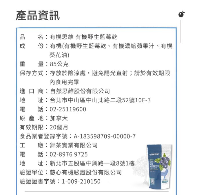 成分:有機野生藍莓乾、有機濃縮蘋果汁、有機葵花籽油