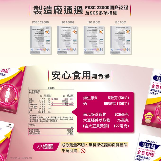 注意事項:▲食用前,請詳讀食用方法。 ▲不建議兒童、少年、孕婦、哺乳期婦女、婦科腫瘤患者或有其家族病史者食用。 ▲異黃酮(Isoflavones)每日食用限量為50毫克以下。 ▲本產品含有大豆及其製品、堅果類及其製品。 ▲產品如已過了保存期限,請勿食用。 ▲食用後如出不適,請停止食用。 ▲請放置於孩童不易拿取處。