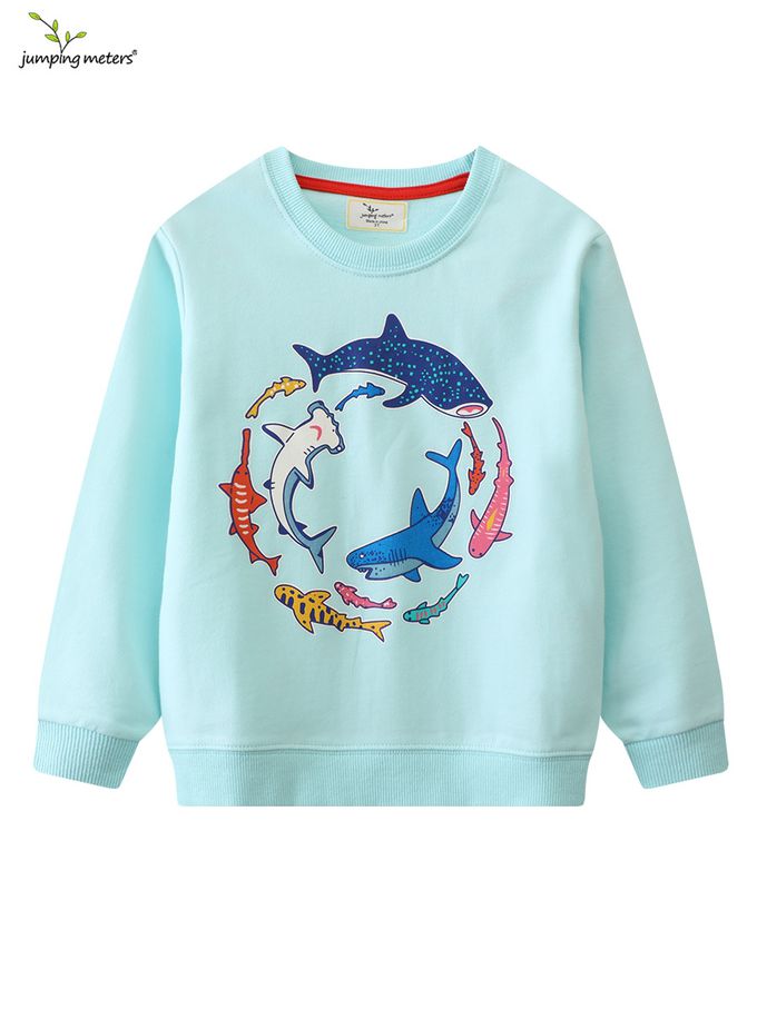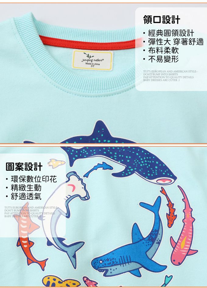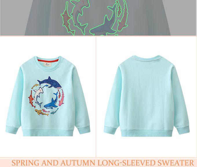夜光圓領棉質長袖上衣/大學T-兇猛魚群-淺藍