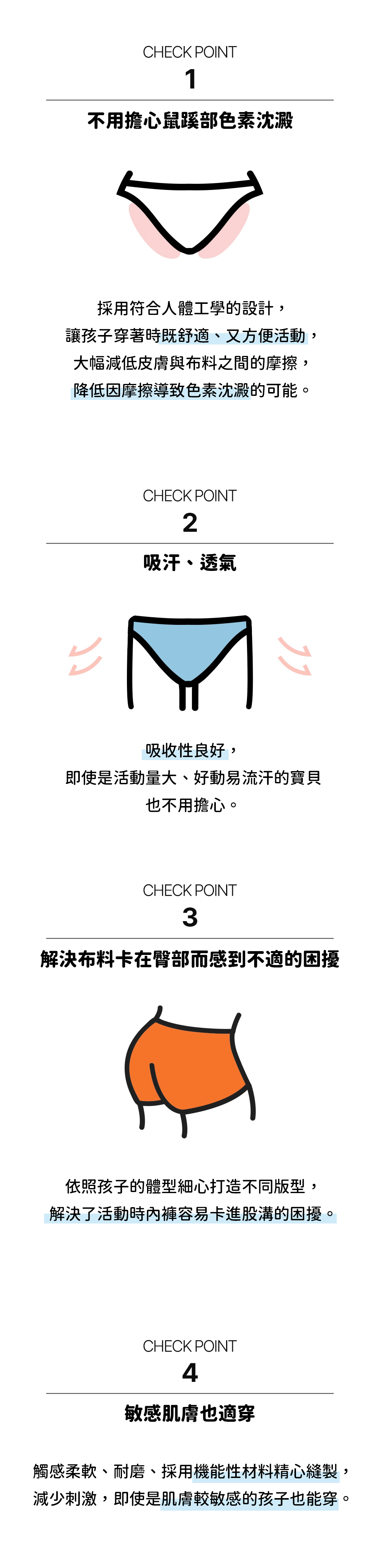 台灣的天氣春夏悶熱、秋冬潮濕,挑選孩子天天穿的內衣褲時,除了舒適度以外,當然也要特別注意透氣快乾縫線不刮膚