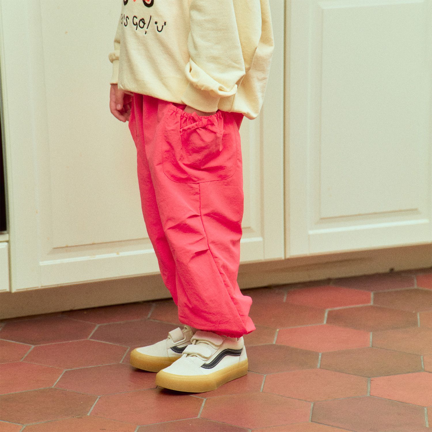 韓國 First Blue - 鬆緊腰打結口袋尼龍縮口長褲-玫紅