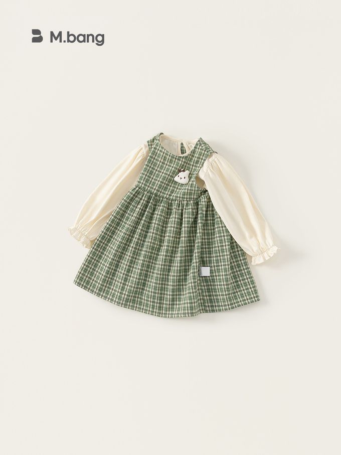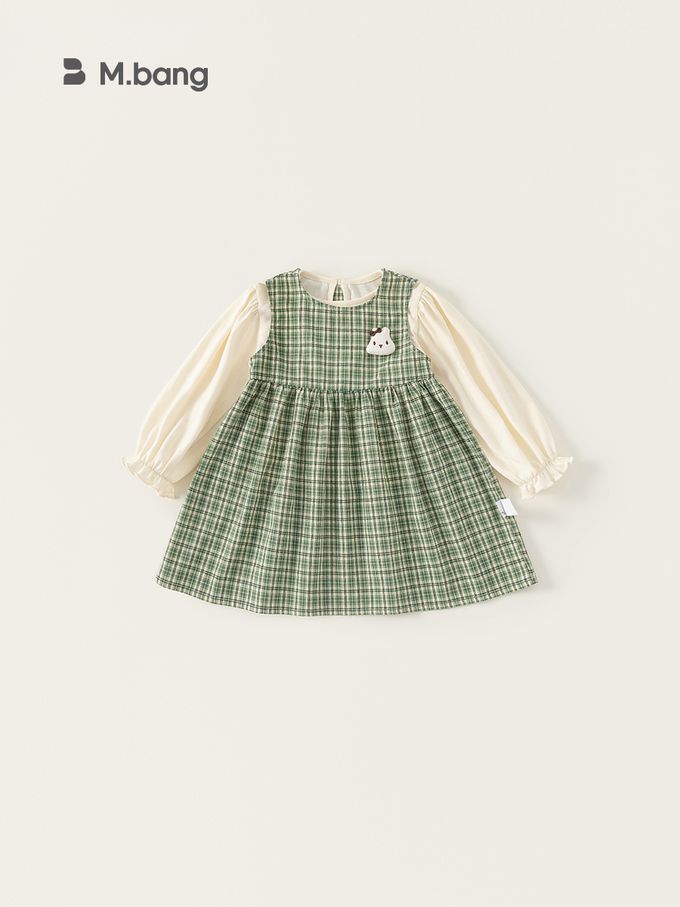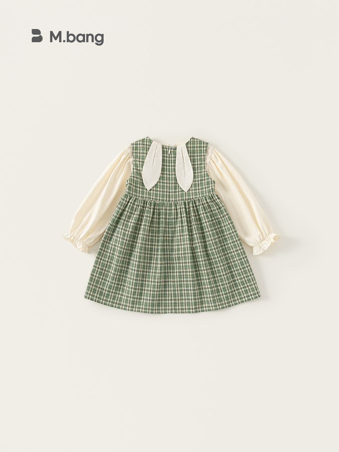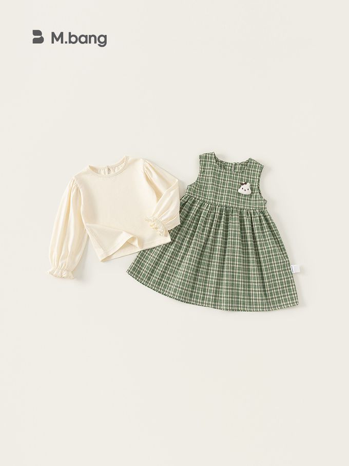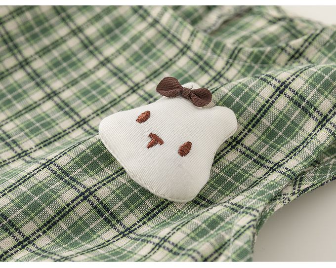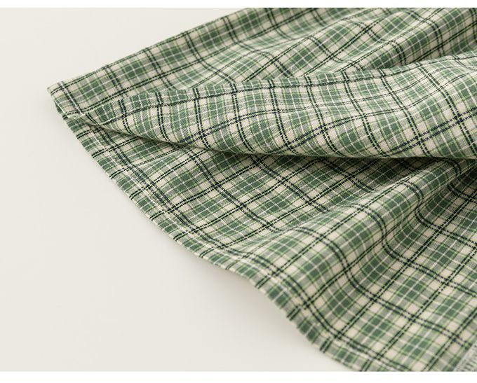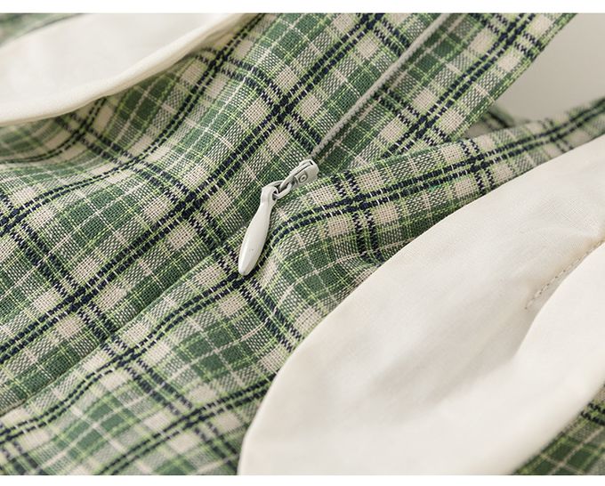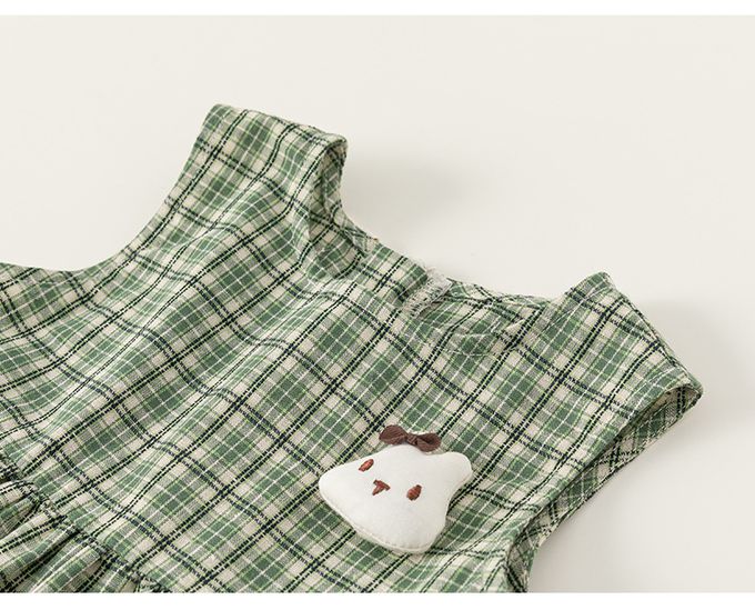 純棉花邊袖兩件式洋裝套裝-立體造型-綠色格紋