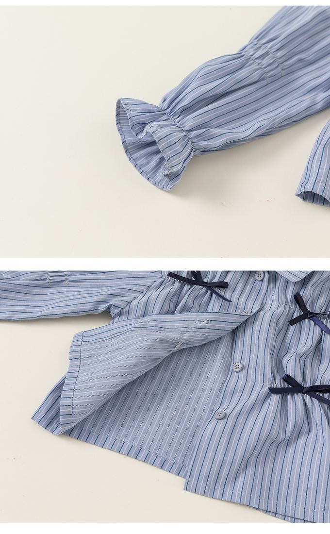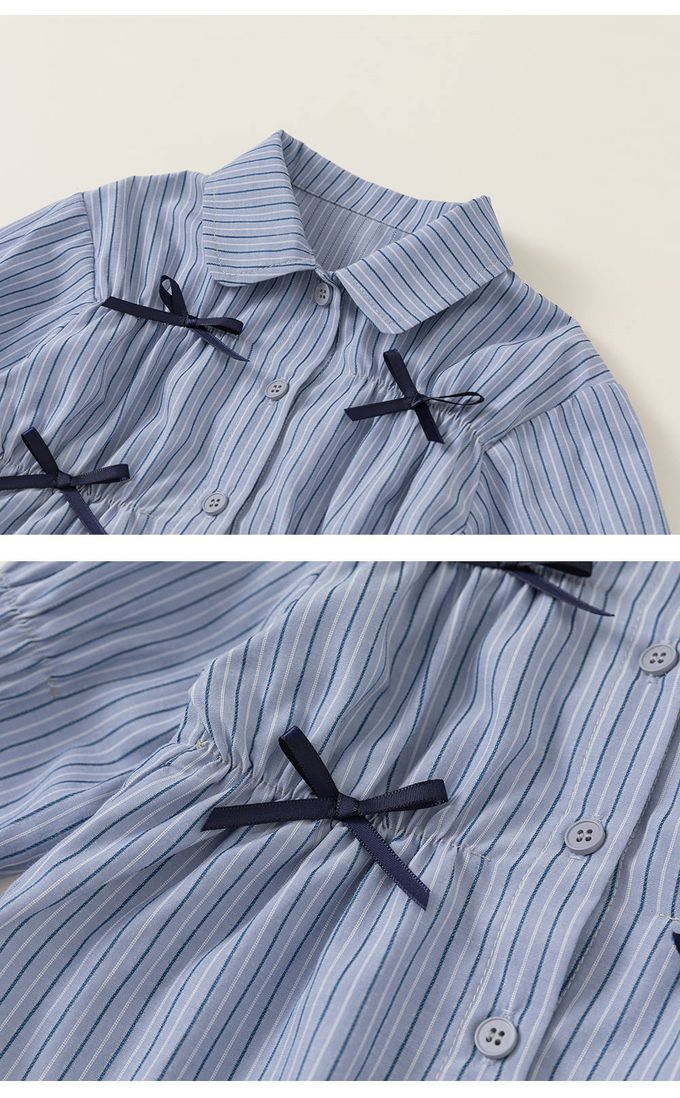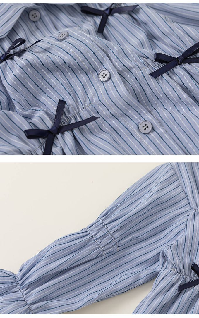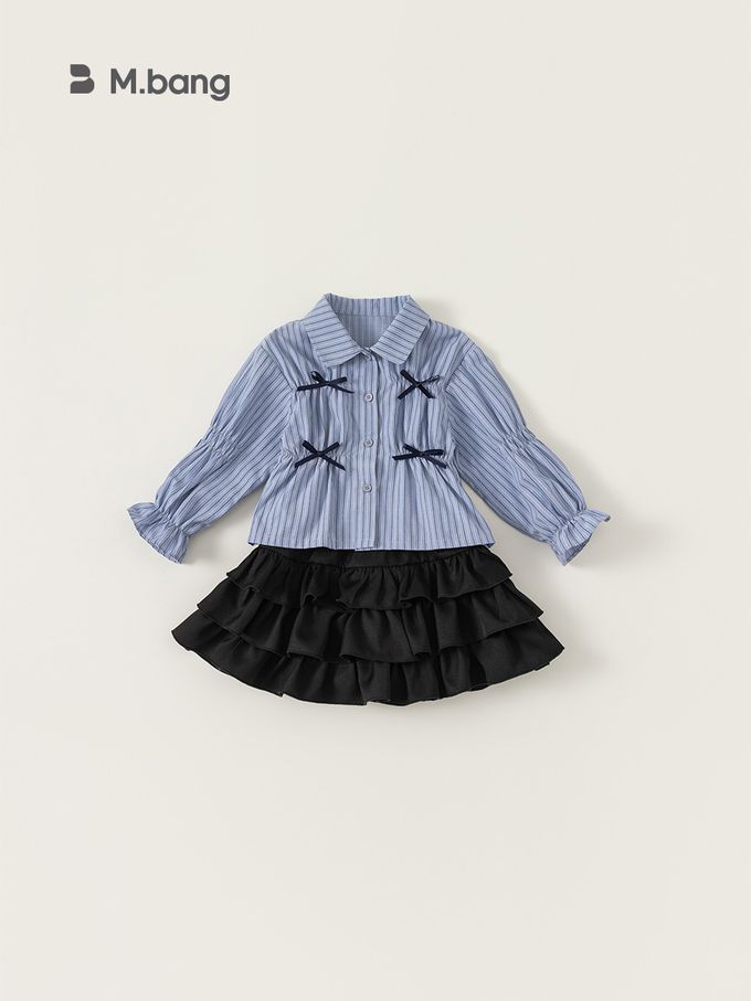 甜美直條紋條紋襯衫+蛋糕裙兩件式套裝-蝴蝶結-藍+黑