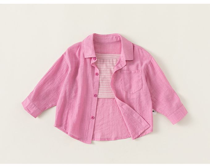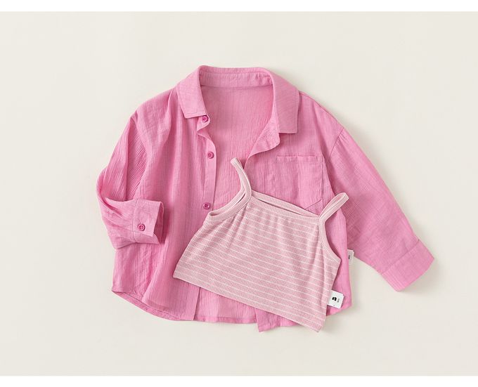 休閒百搭翻領襯衫+背心兩件式套裝-條紋-粉色