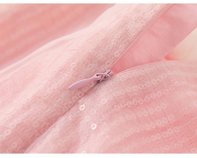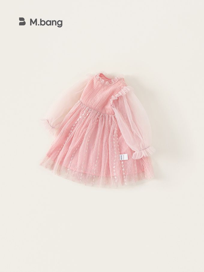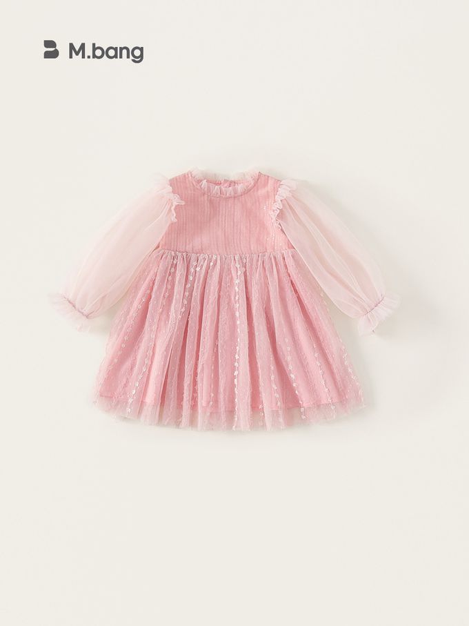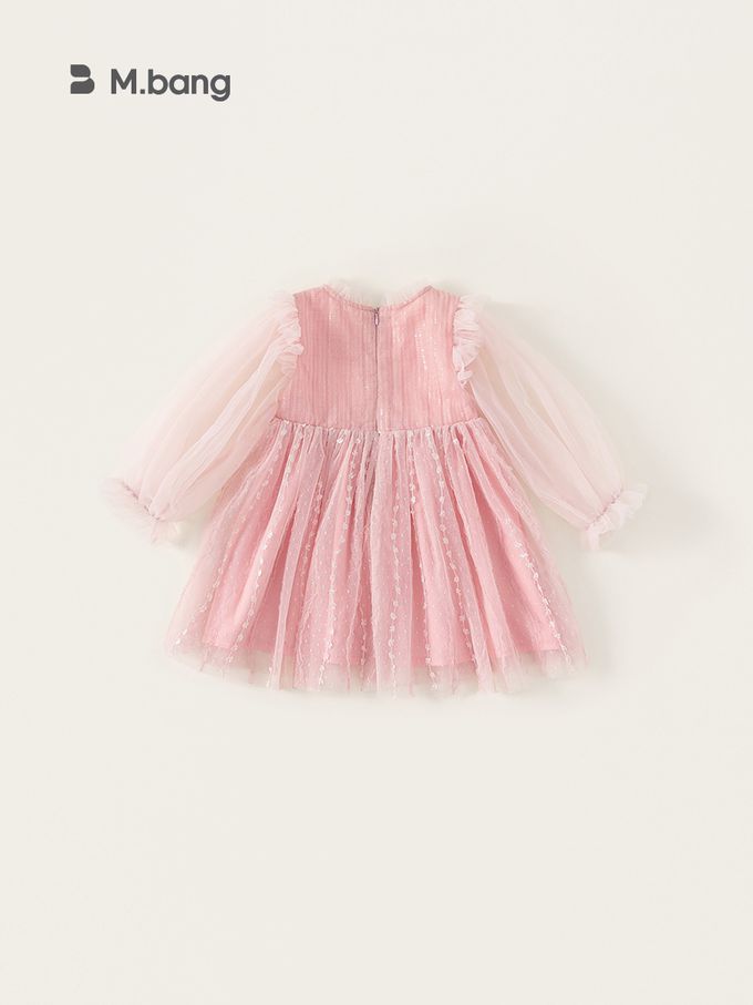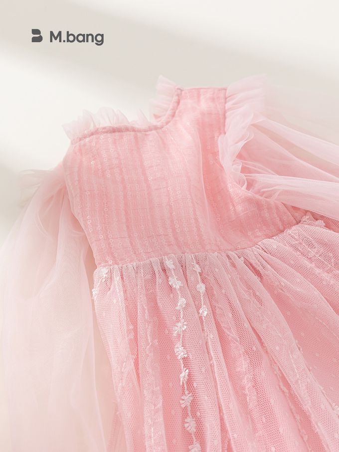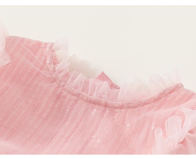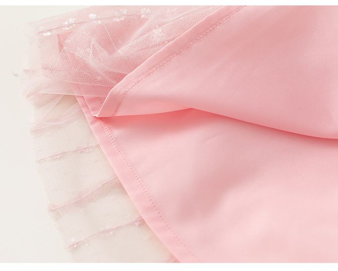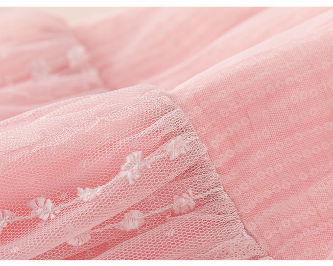仙氣飄飄網紗拼接洋裝-花邊袖-粉色