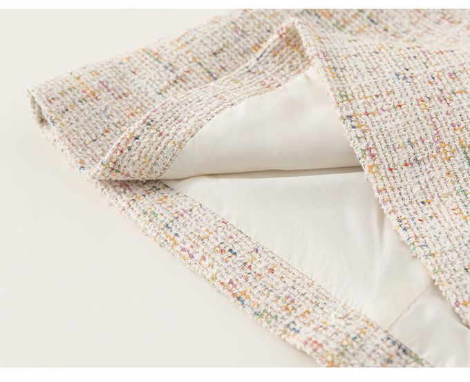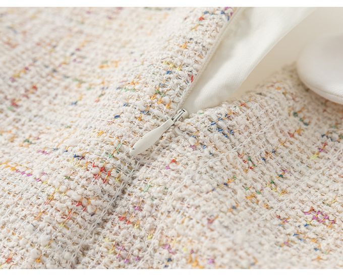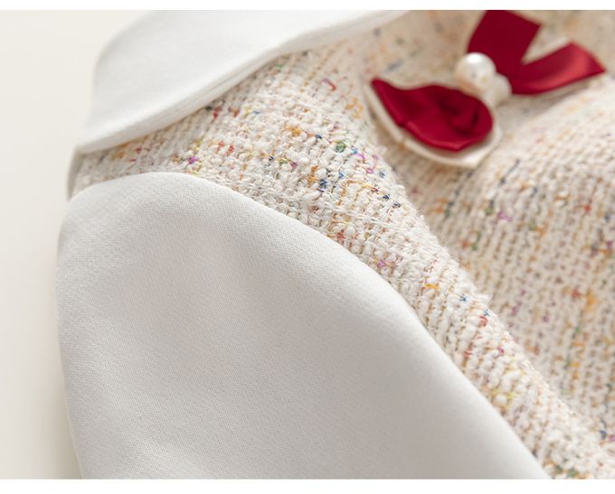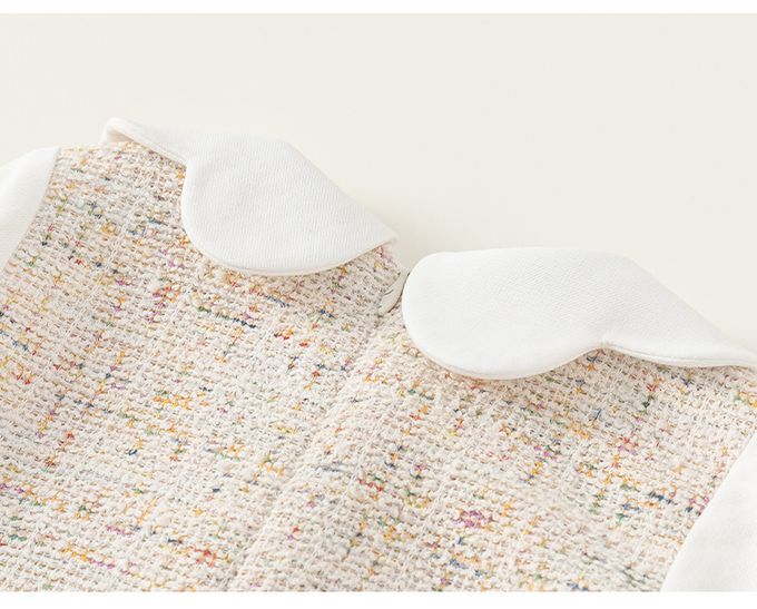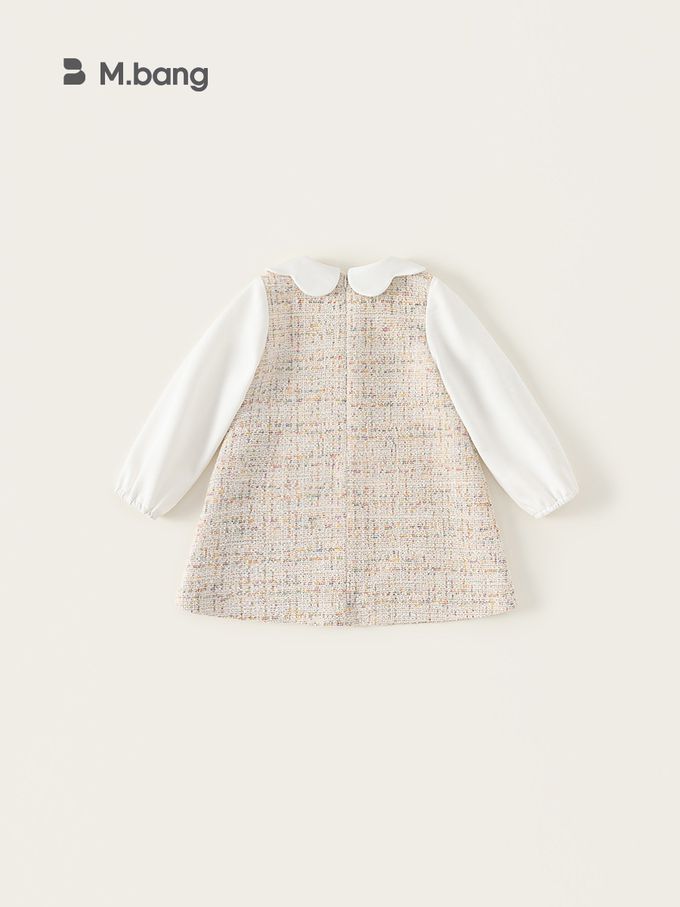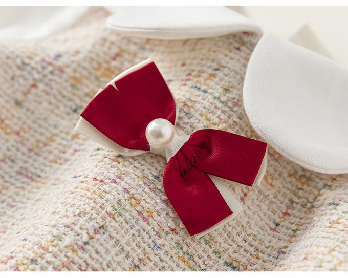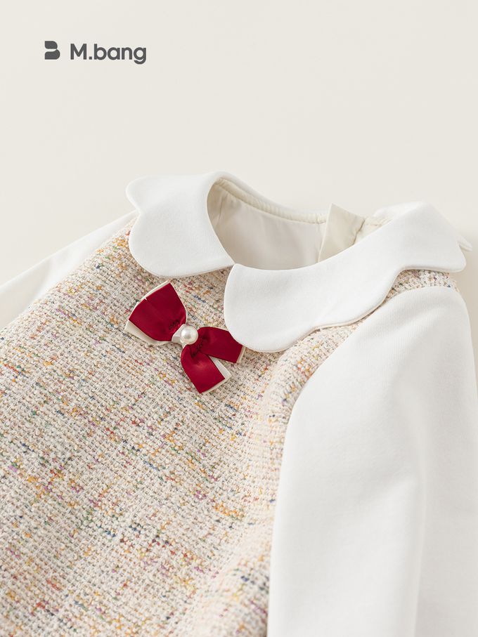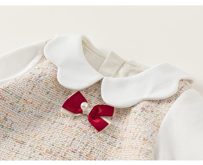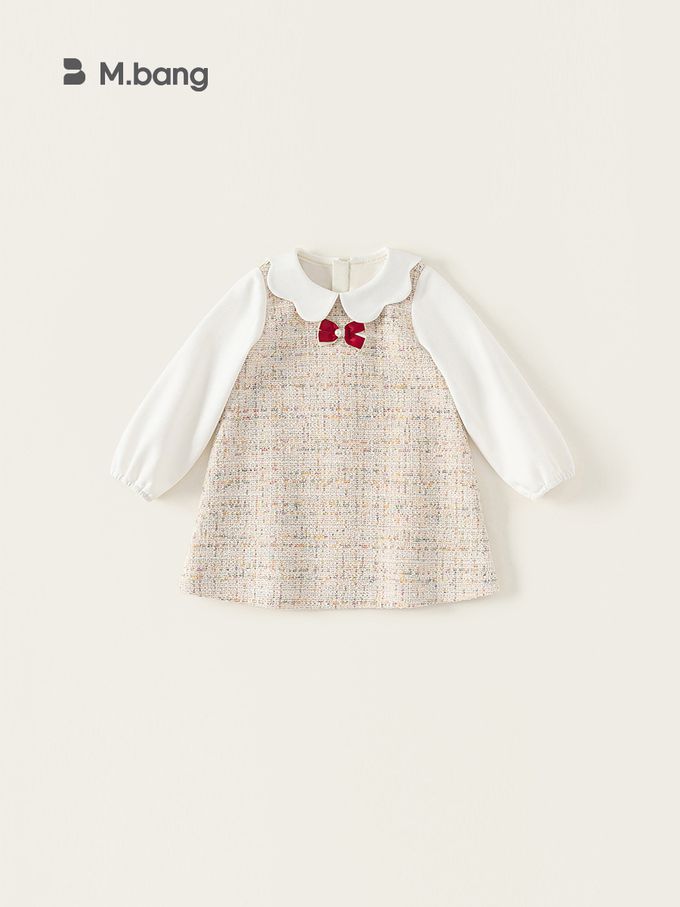 花邊領拼色假兩件小香風洋裝-珍珠蝴蝶結-米杏