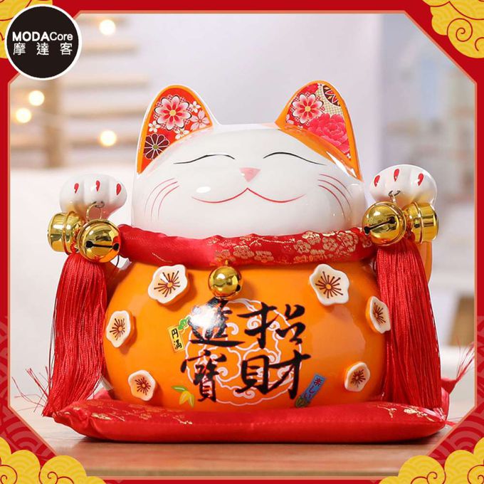 品名:◉春節開運招財◉8.5吋橘色招財進寶招財貓(含坐墊)_撲滿存錢桶擺飾桌飾