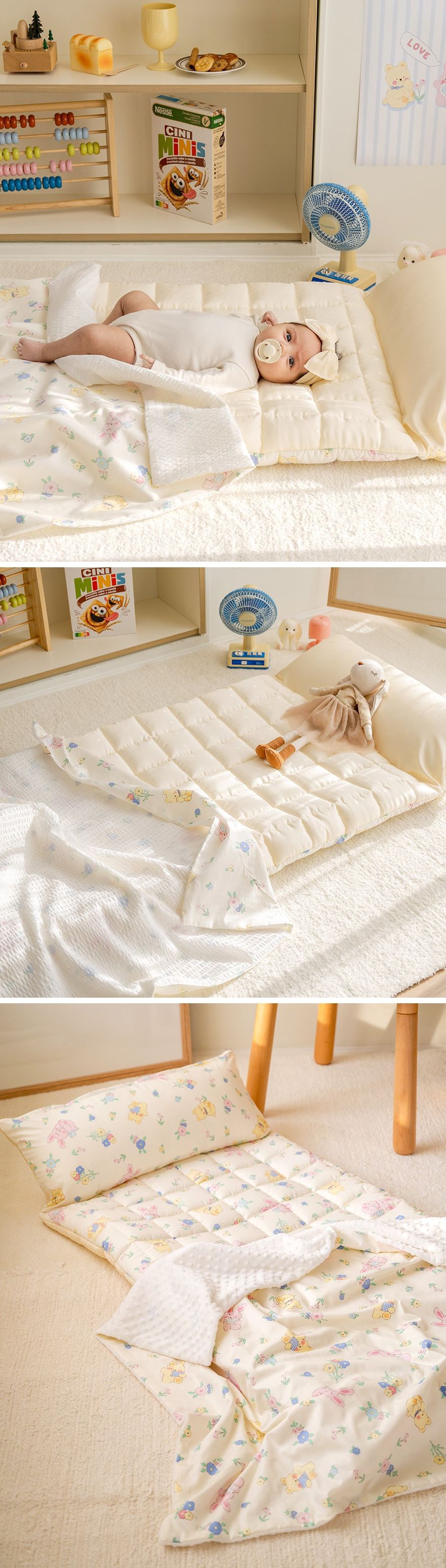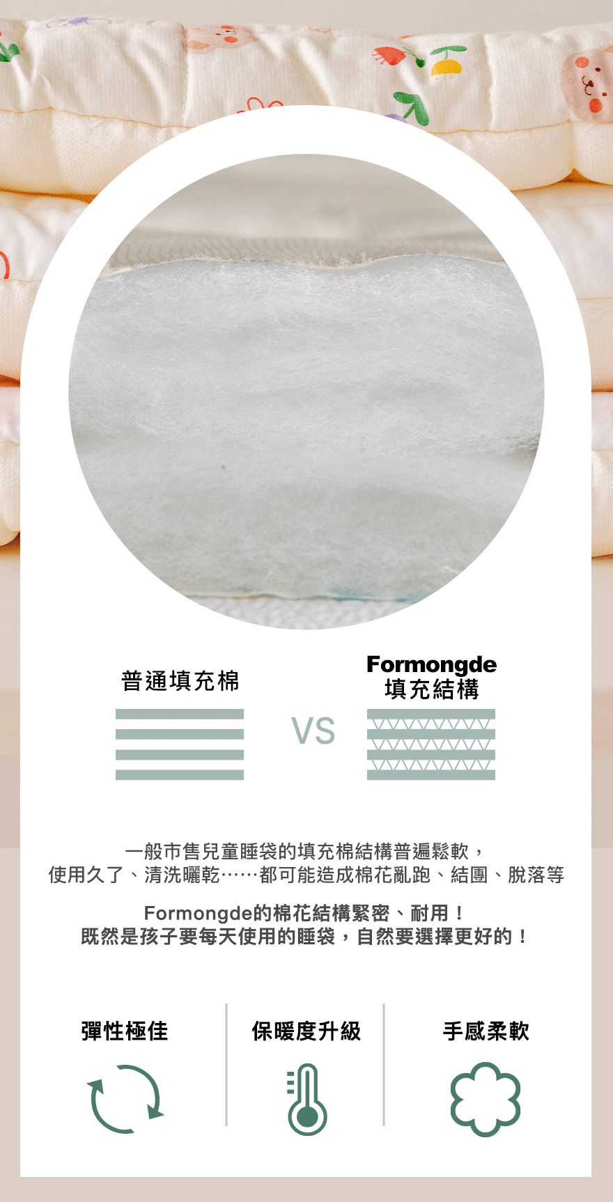 有圖案那面是用精梳棉織成的,四季都適合使用,是睡袋最基本也最經典的材質~而素色這面則是嫘縈所織成,嫘縈屬於涼感纖維,讓寶貝在夏天也不會因為墊子使背部悶熱睡不好!偷偷告訴各位媽咪,其實嫘縈在韓國是非常受歡迎的夏日涼感材質噢!
