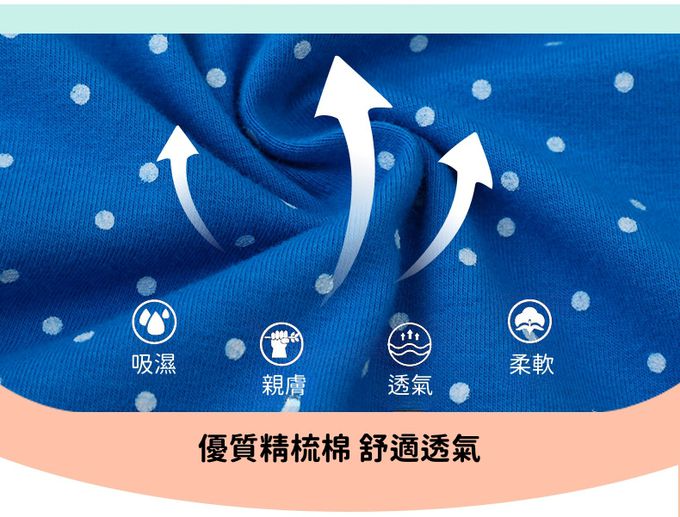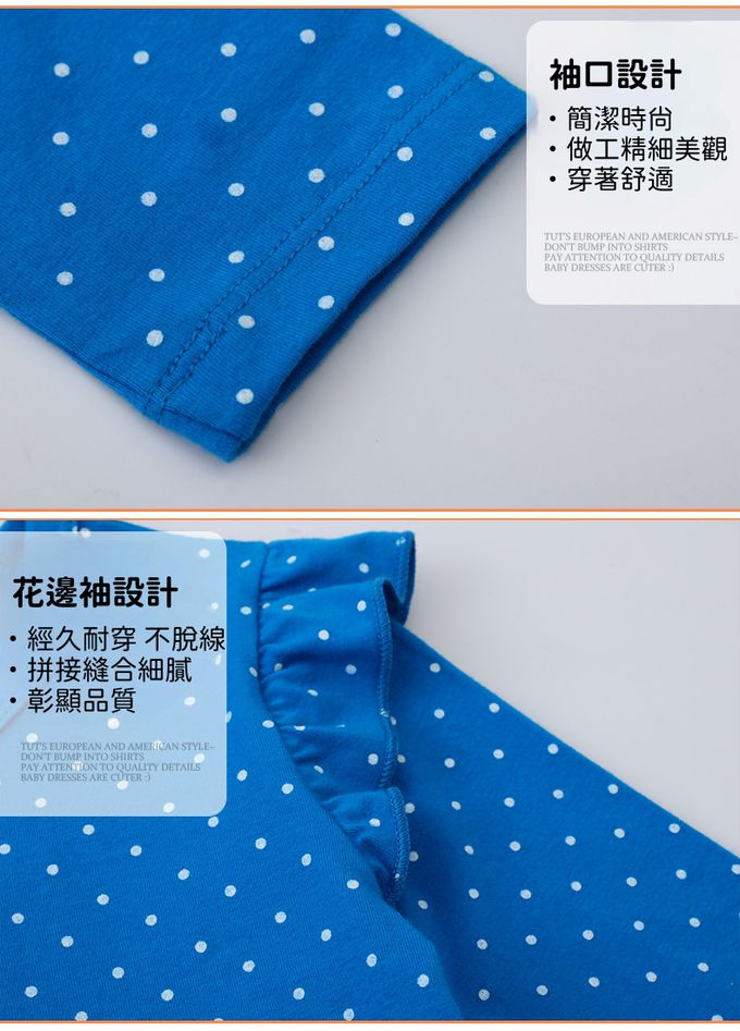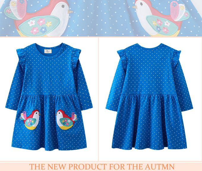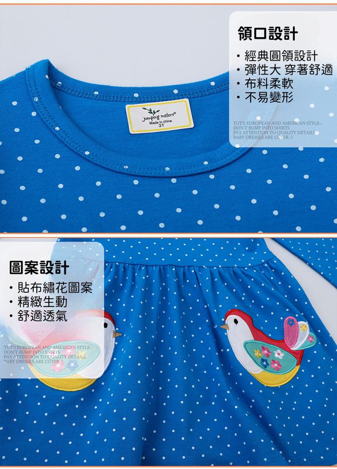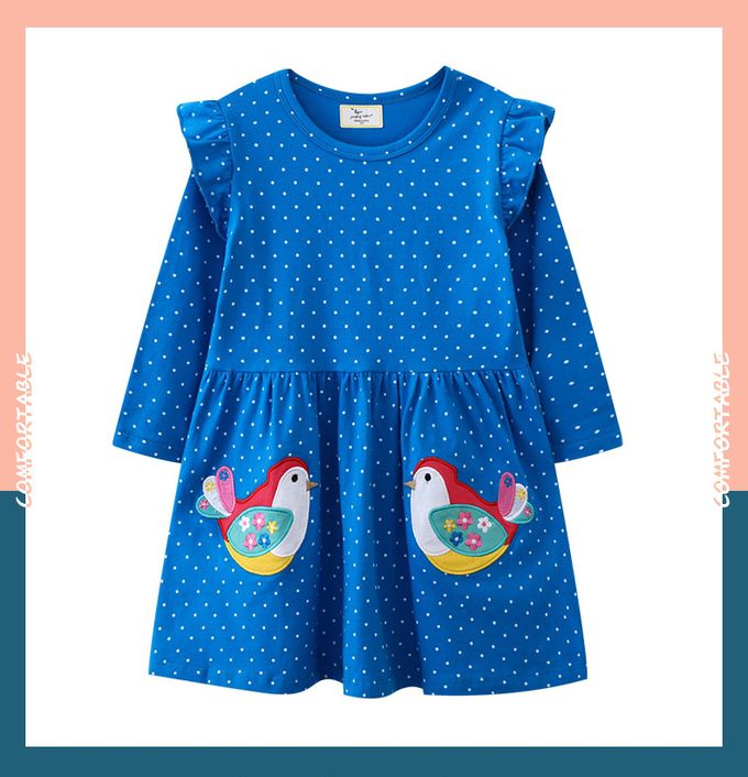棉質圓領長袖連身洋裝-花朵翅膀鳥兒-藍色點點