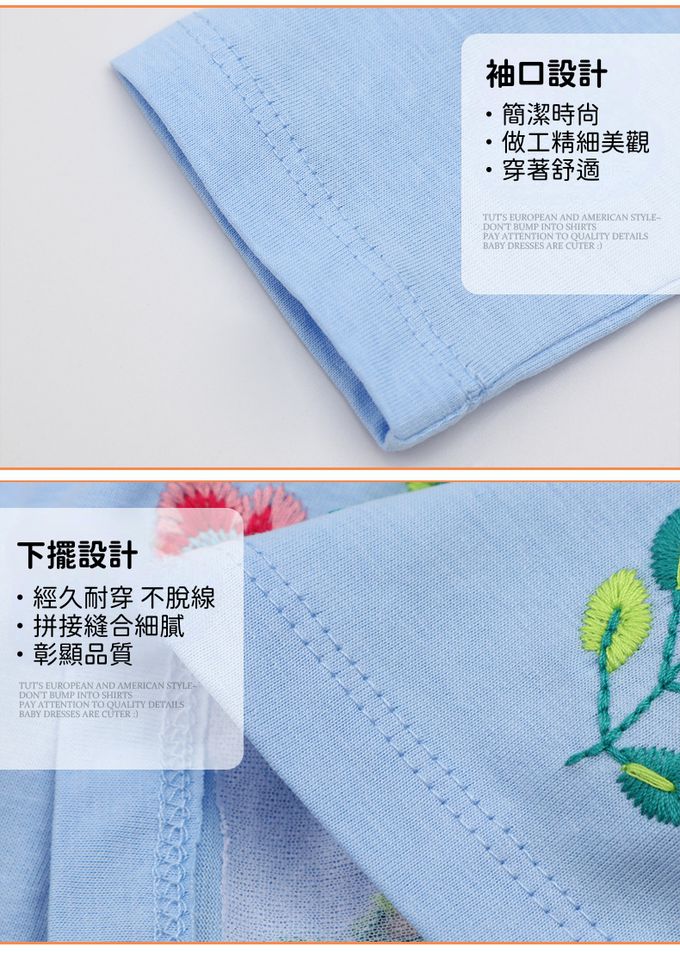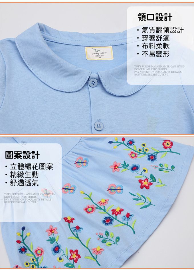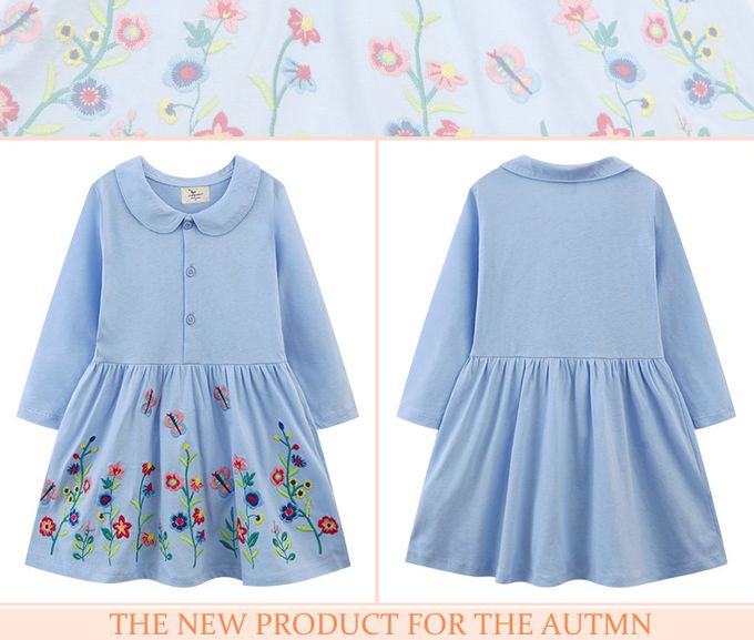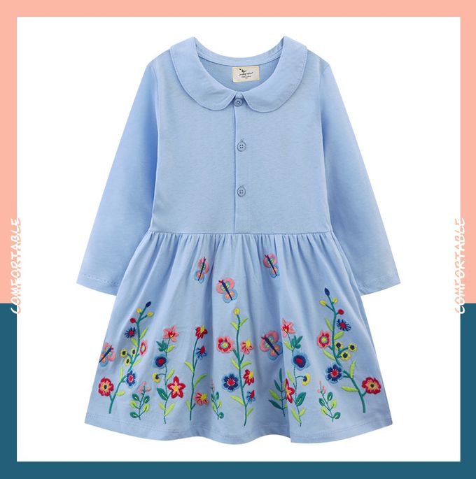 棉質娃娃領長袖連身洋裝-刺繡蝴蝶花朵-藍色