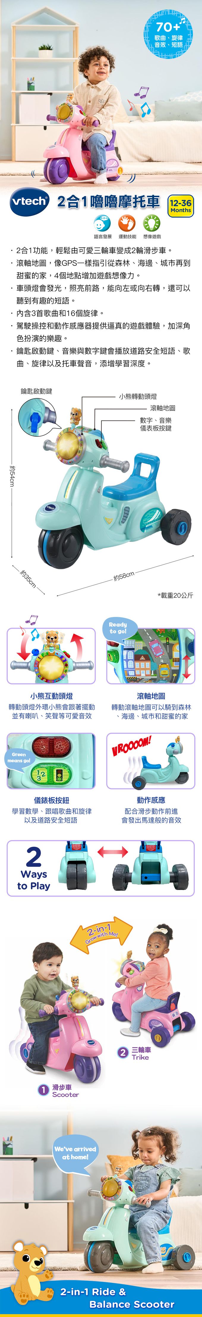 ‧ 鑰匙啟動鍵、音樂與數字鍵會播放道路安全短語、歌曲、旋律以及托車聲音,添增學習深度。