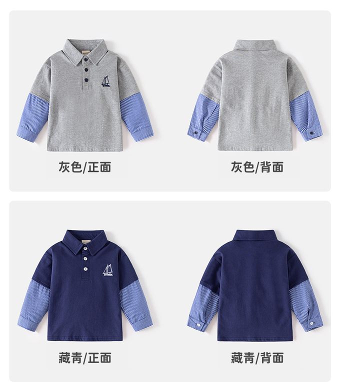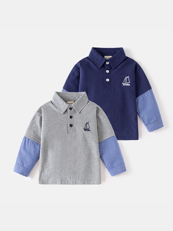 假兩件袖拼接翻領長袖上衣-帆船-灰色
