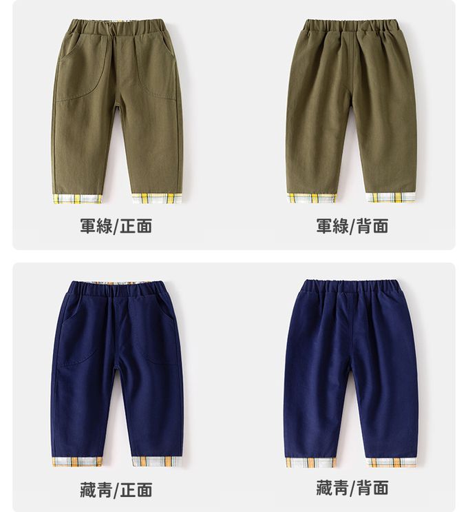 純棉腰鬆緊休閒長褲-褲腳格紋拼接-軍綠