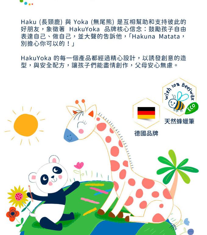 Haku (長頸鹿) 與 Yoka (無尾熊) 是互相幫助和支持彼此的好朋友,象徵著 Haku Yoka 品牌核心信念:鼓勵孩子自由表達自己、做自己,並大聲的告訴他,「Hakuna Matata,別擔心你可以的!」