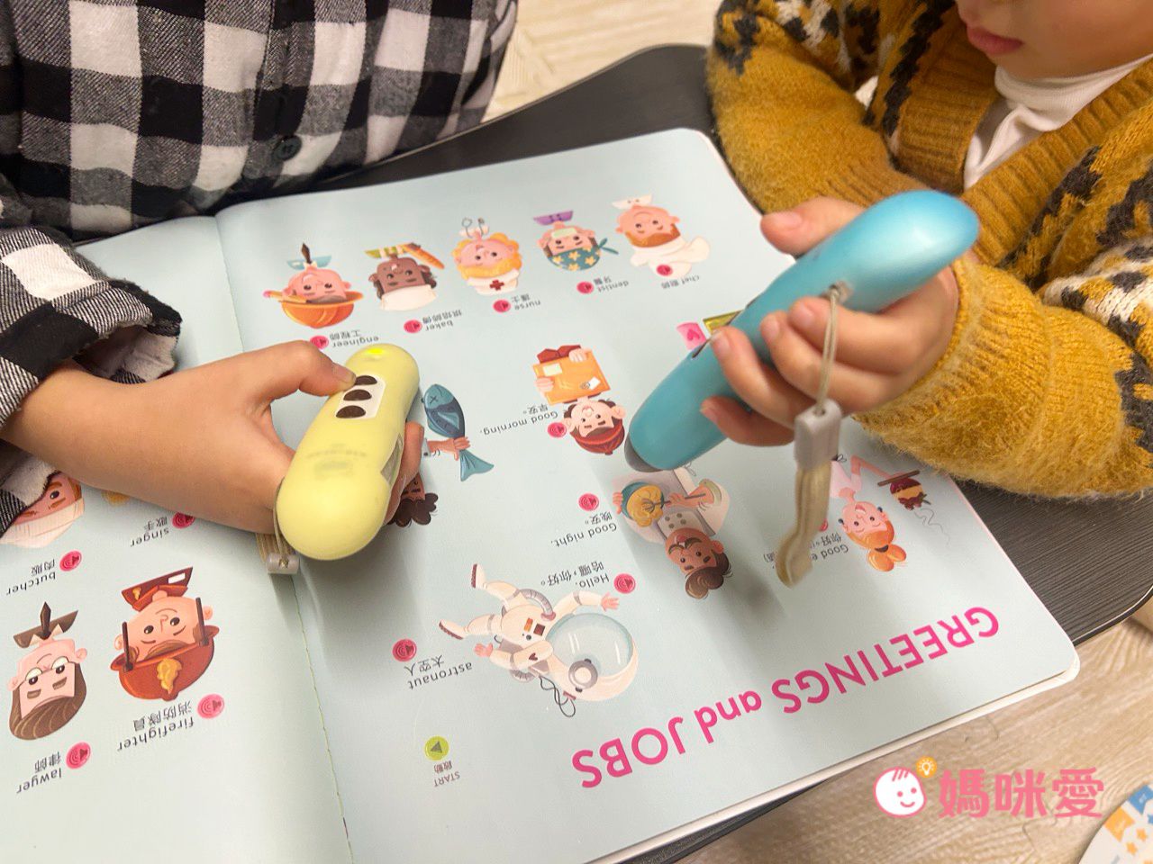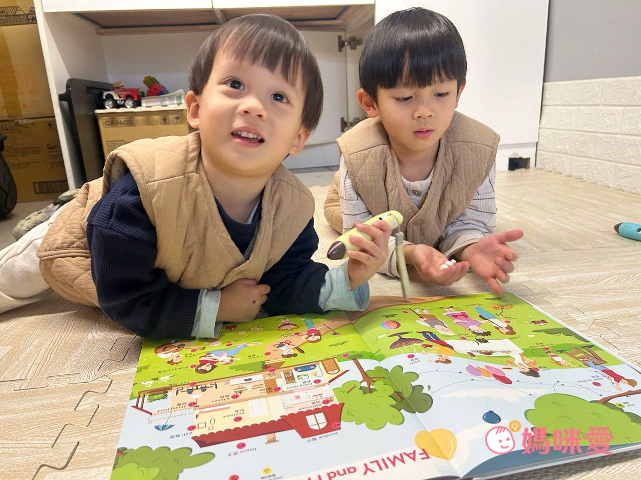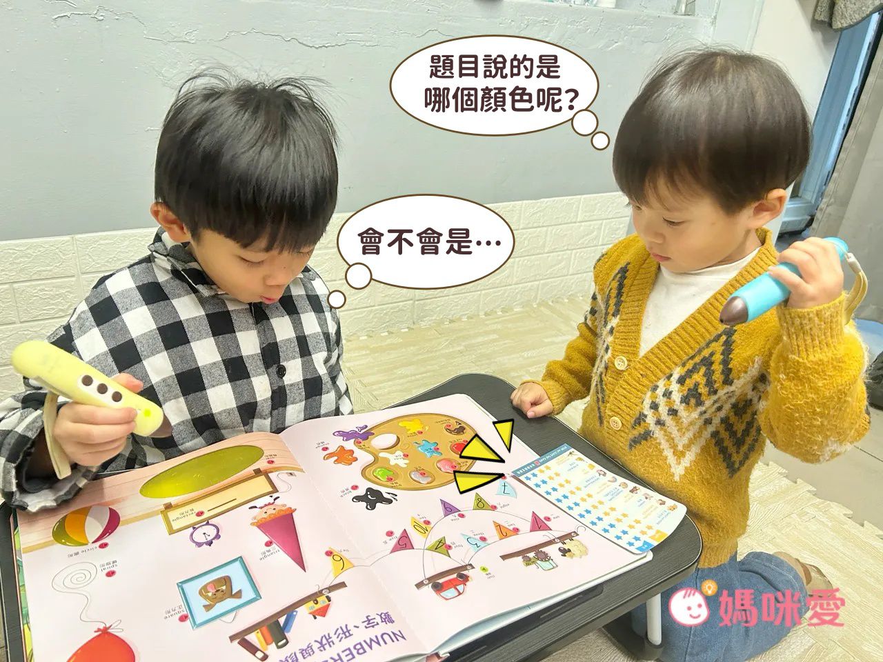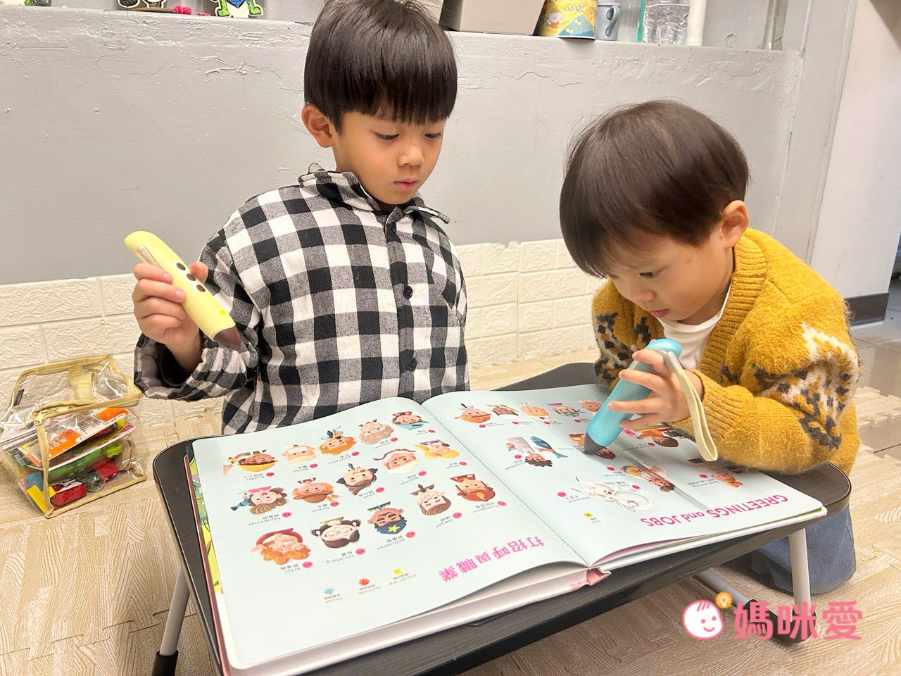 他們一人拿一支點讀筆,同時進行考試!看誰先找到誰先完成點讀筆小老師出的題目⋯就這樣度過了整個週六下午,小孩開心又有學習到,媽媽也開心:)
