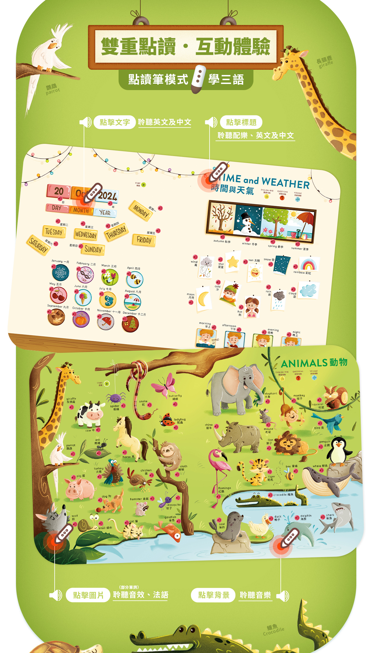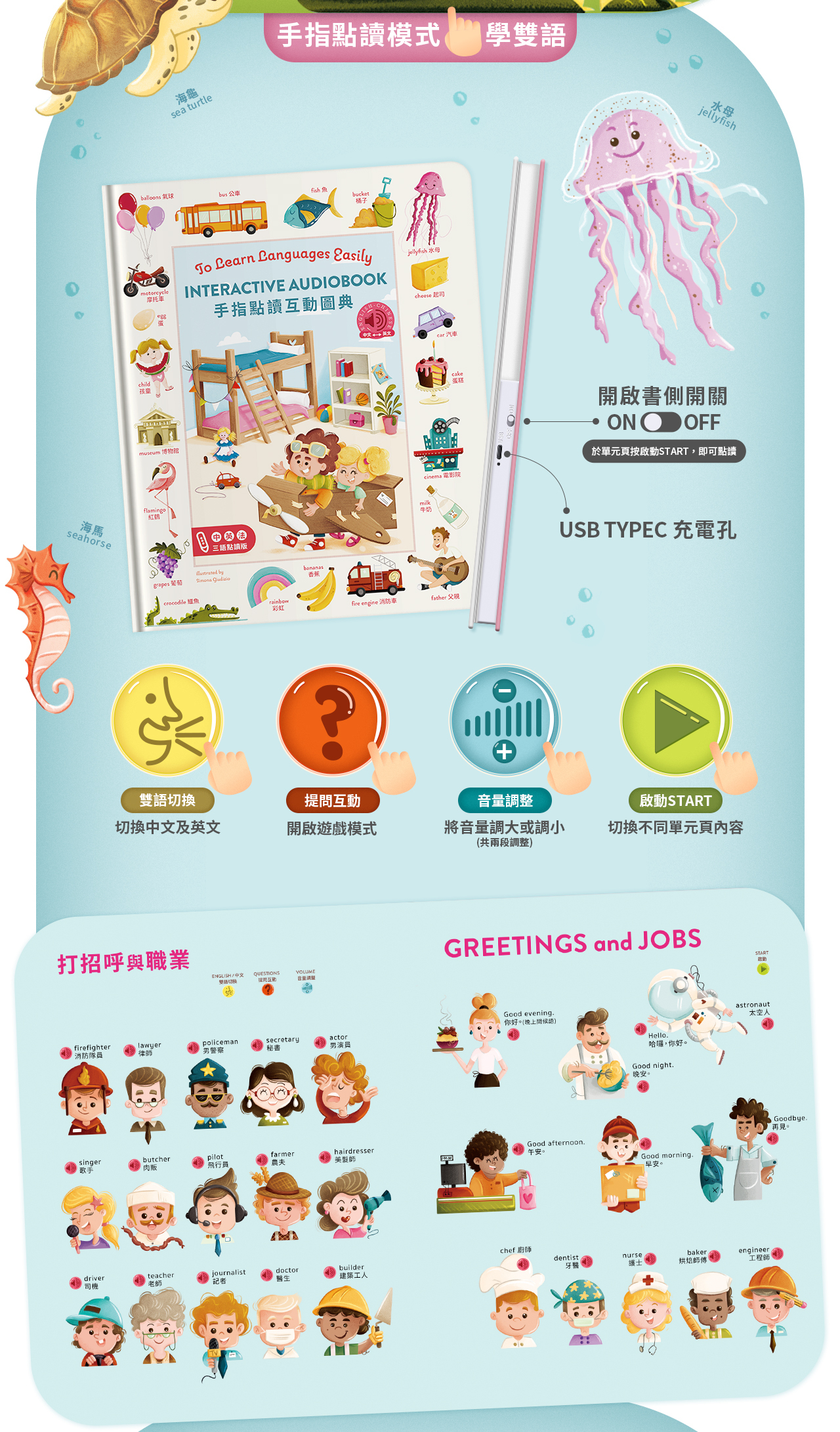 有別於以往只能使用點讀筆的互動書,用手指就可以做互動學習,讓月齡較小或還不會抓握的小baby就可以直接用手指點書,輕鬆聆聽圖典🎵