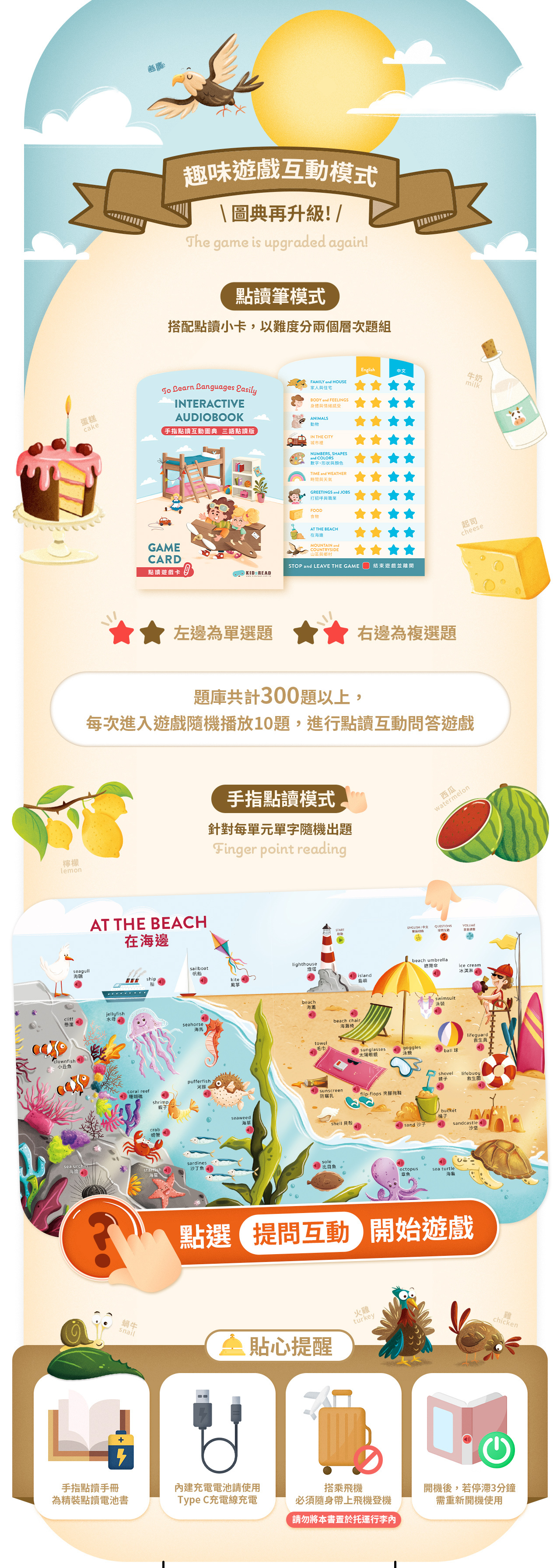 就是遊戲點讀小卡啦!在閱讀完一個主題或是整本書後可以透過點讀筆進行小遊戲,加深學習印象~!