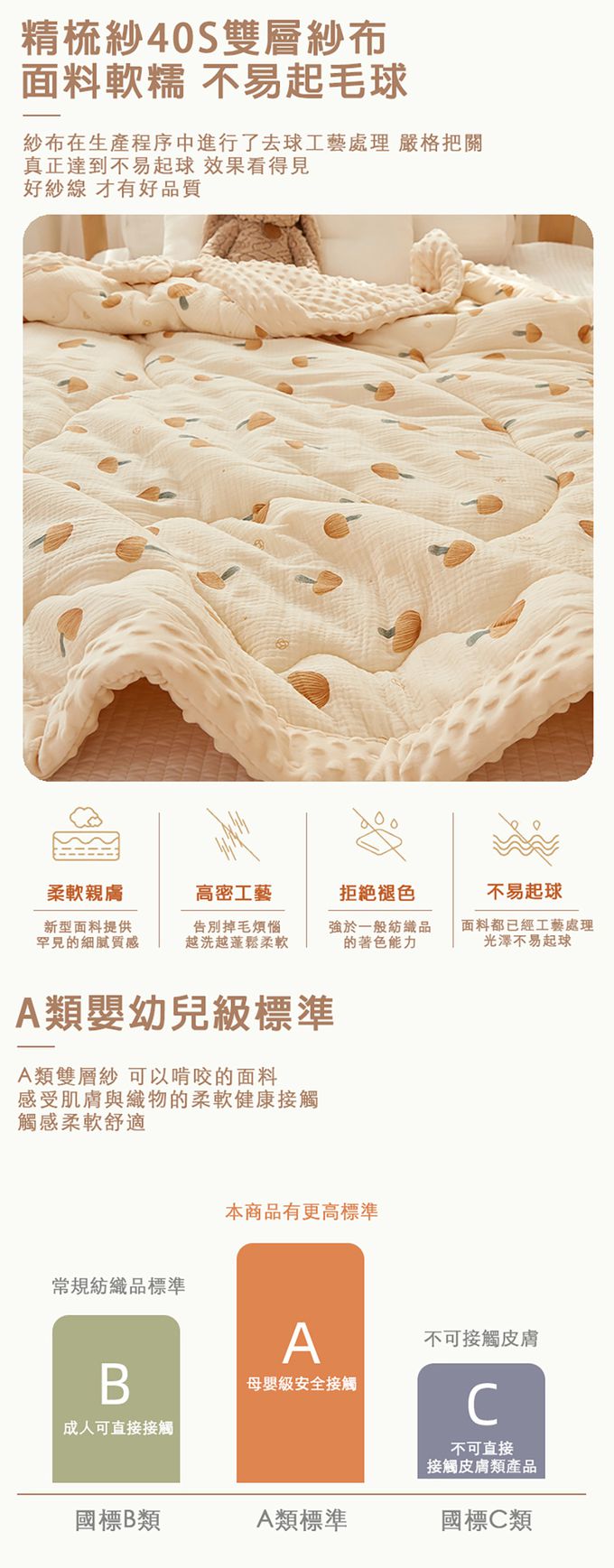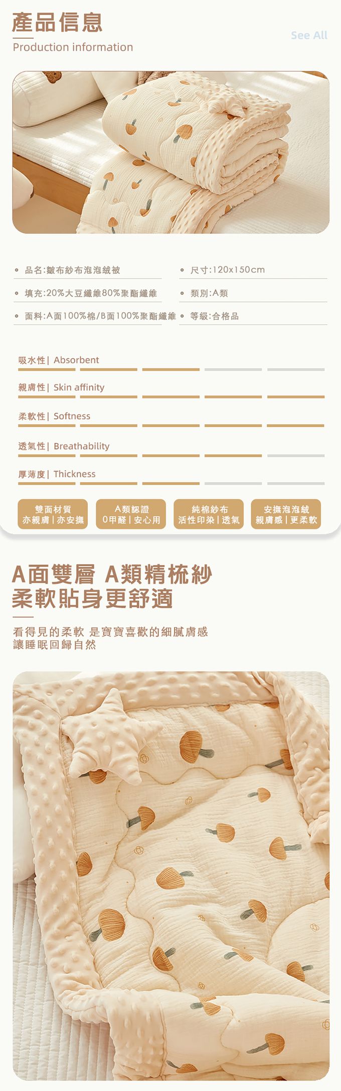 材質:A面100%棉、B面100%聚脂纖維、填充物20%大豆纖維80%聚酯纖維