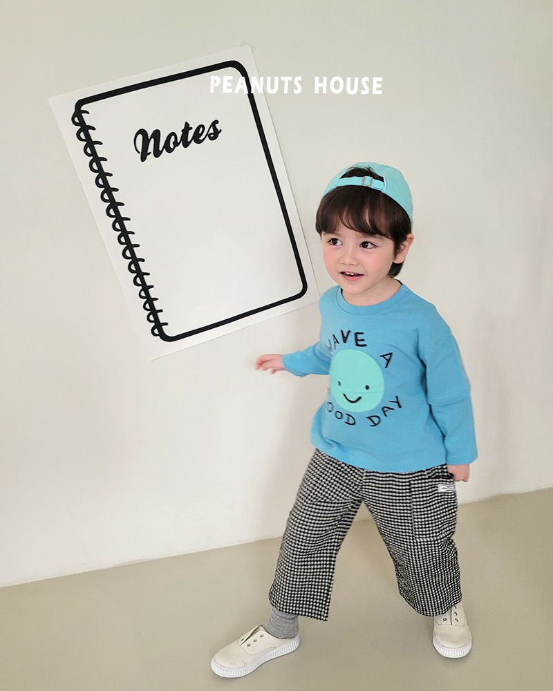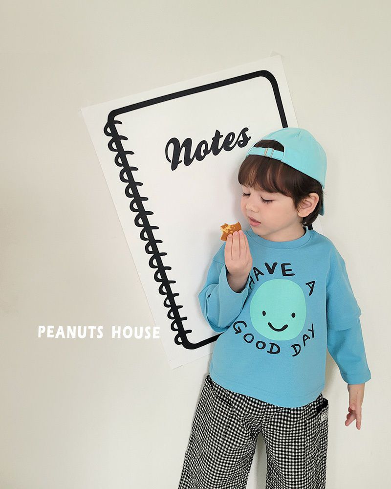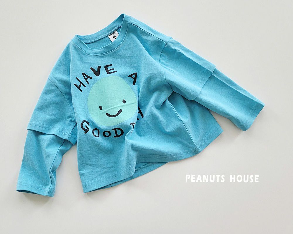 韓國 Peanuts House - 萌萌圓笑臉純棉拼接袖上衣-水藍