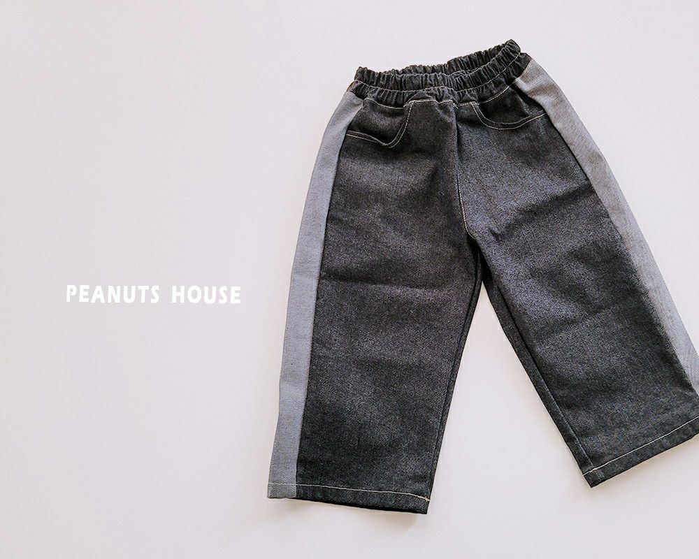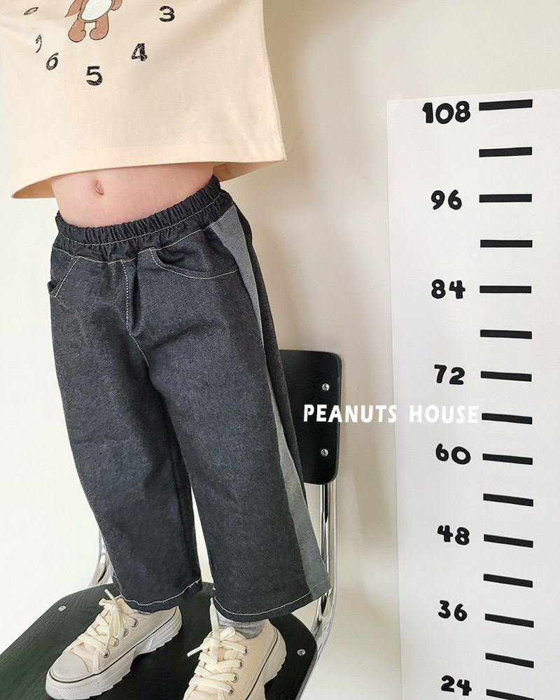 韓國 Peanuts House - 鬆緊腰潮流拼接丹寧寬褲