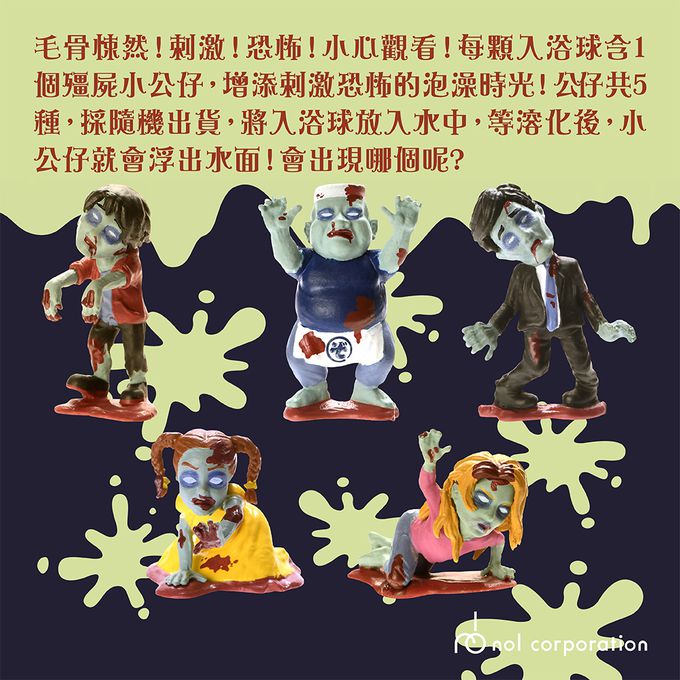 每顆入浴球含1個殭屍小公仔,增添刺激恐怖的泡澡時光! 公仔共5種,採隨機出貨,將入浴球放入水中,等溶化後,小公仔就會浮出水面!會出現哪個呢?