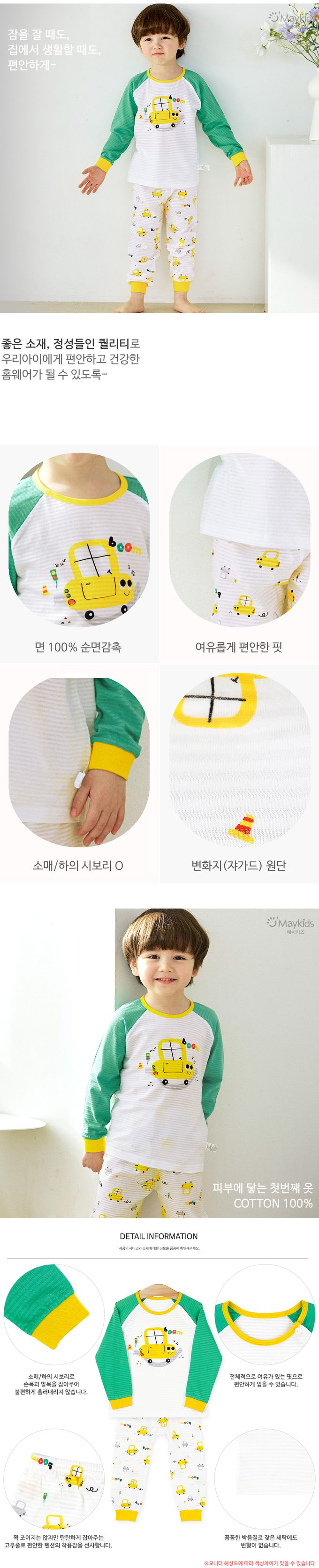 韓國 Maykids - 透氣條紋提花棉長袖家居服-黃色車車-綠X黃