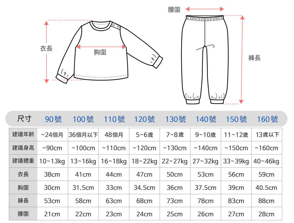 1. 尺寸表單位皆為公分(cm),實際尺寸會因布料彈性、水洗、測量起迄點等因素略有誤差。建議參考孩子平時穿著衣物尺寸進行選購。