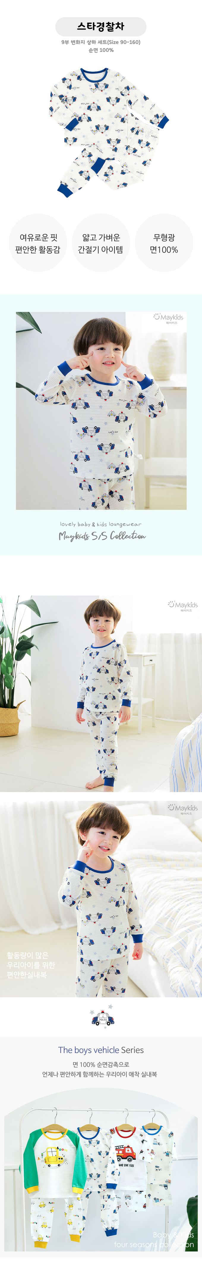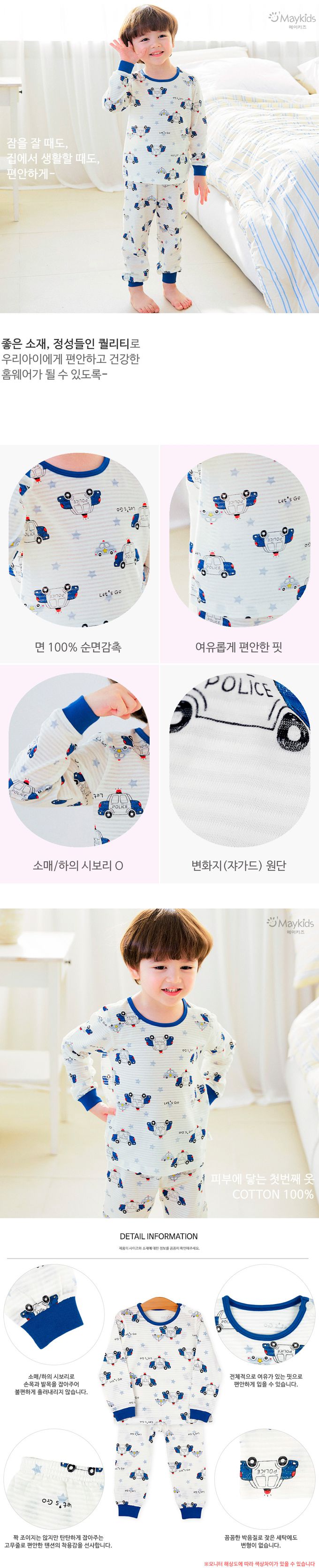韓國 Maykids - 透氣條紋提花棉長袖家居服-警察車車