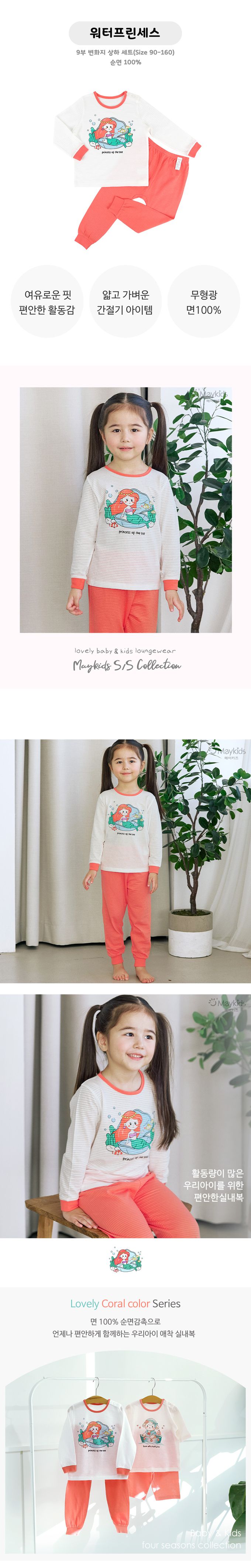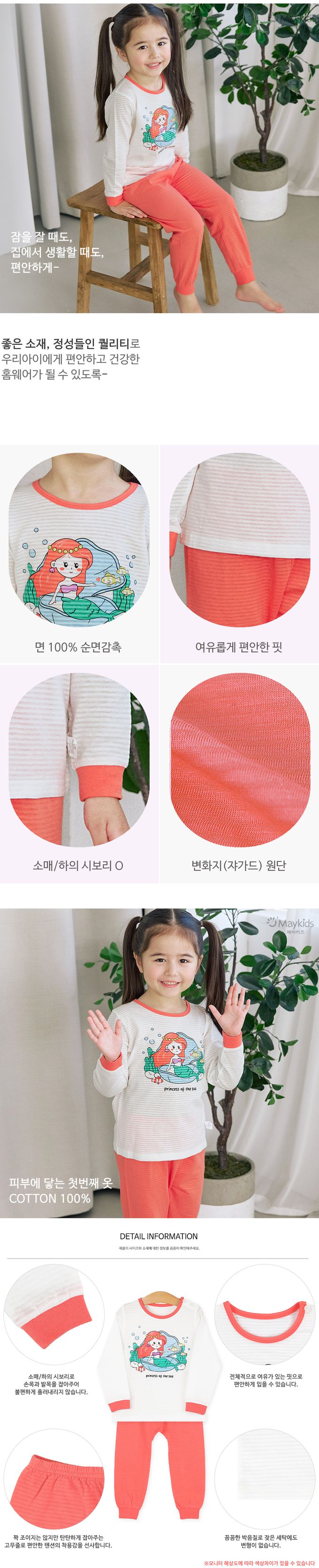 韓國 Maykids - 透氣條紋提花棉長袖家居服-卡通人魚公主-米白X橘紅
