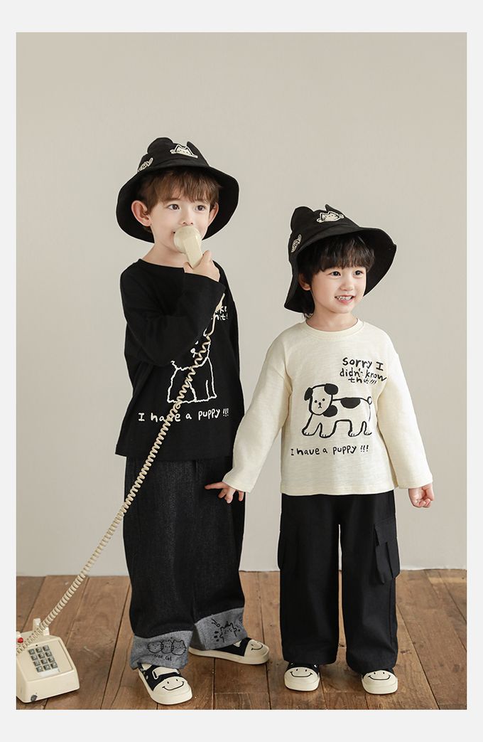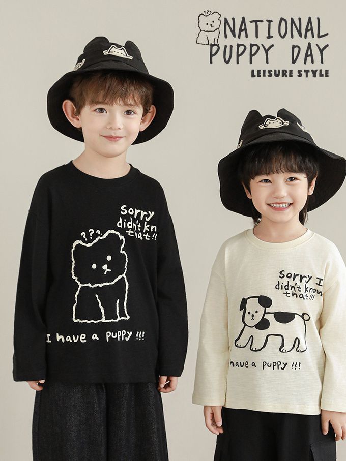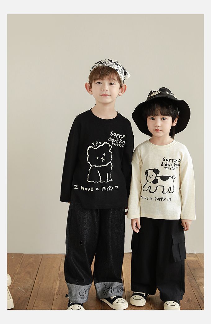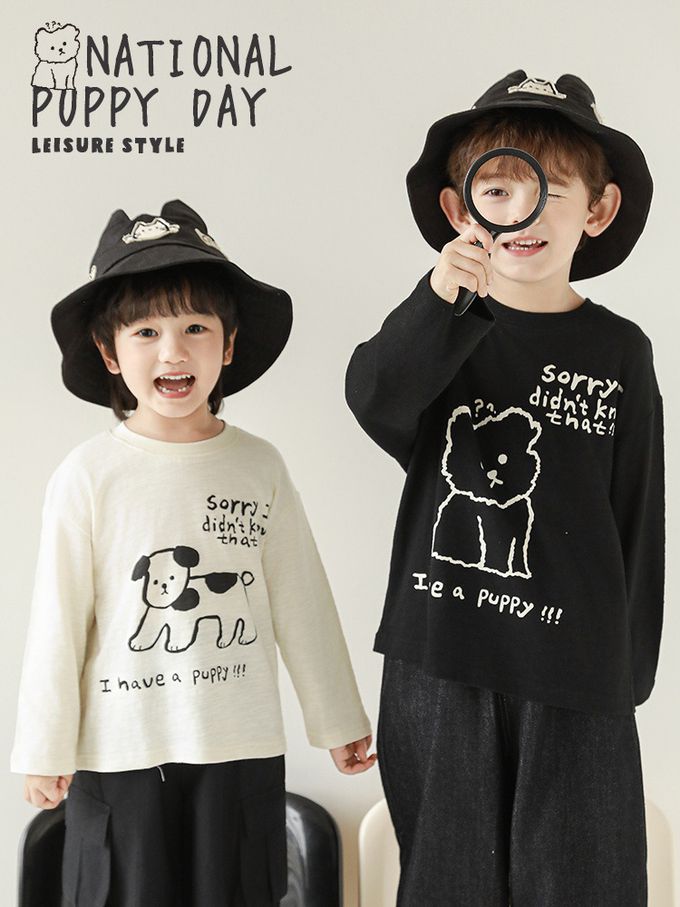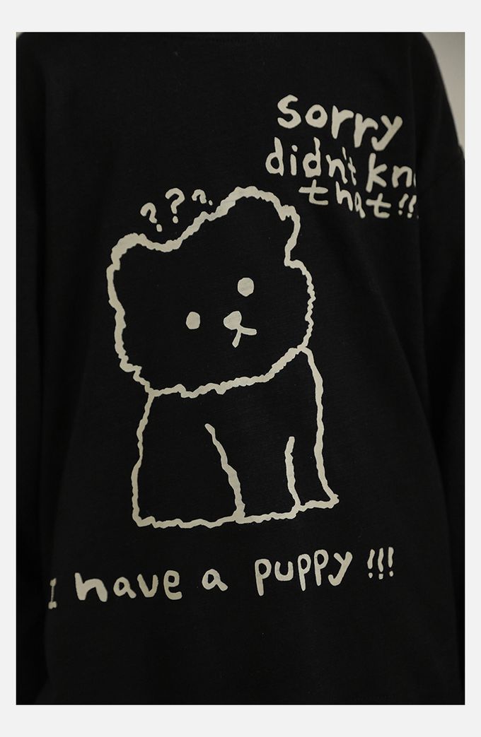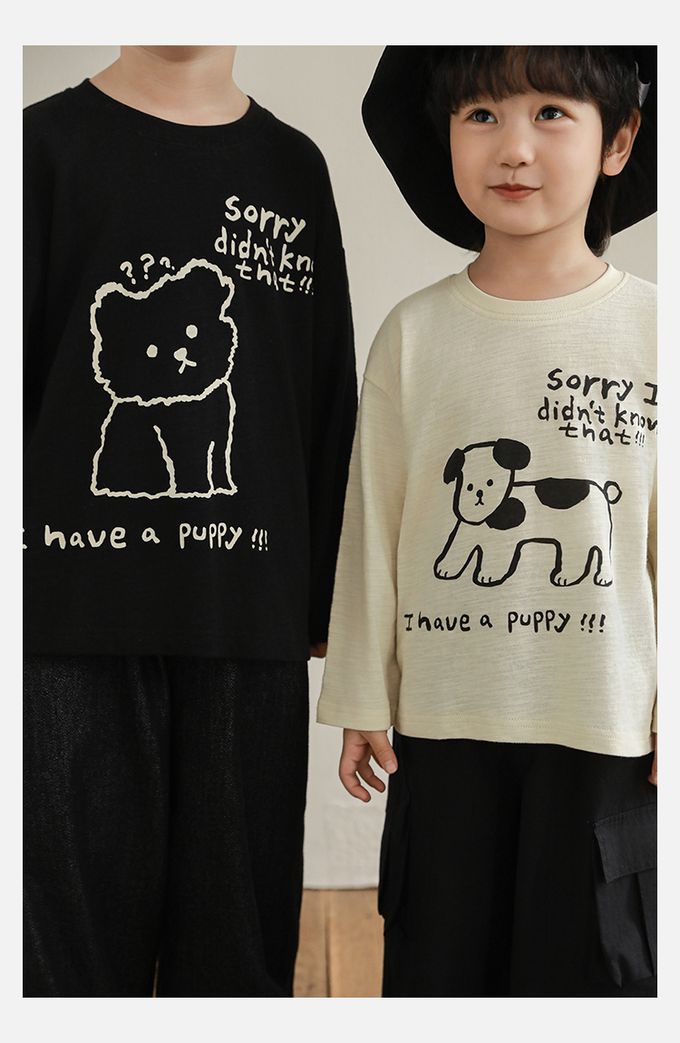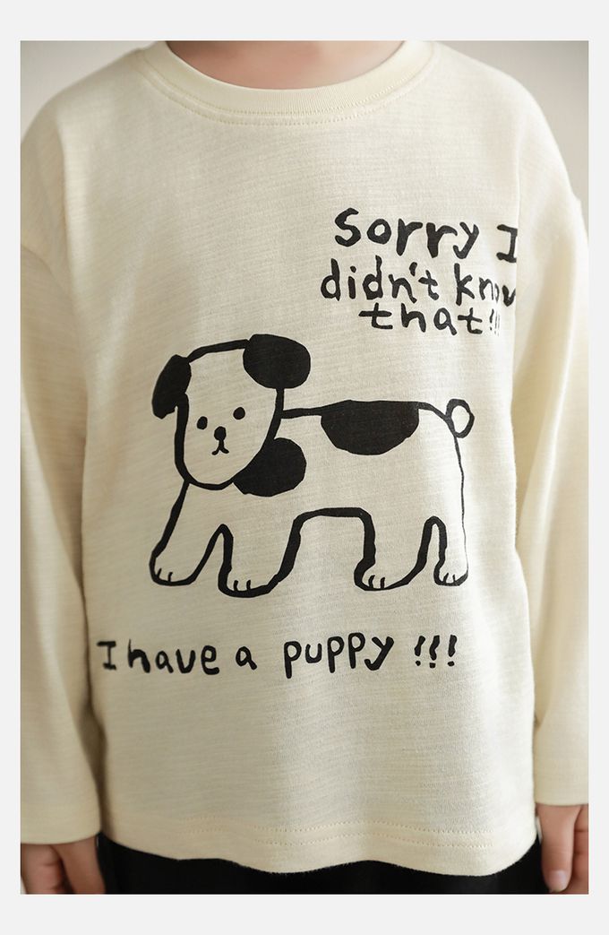 純棉竹節紋圓領落肩長袖上衣-萌趣狗狗-米色