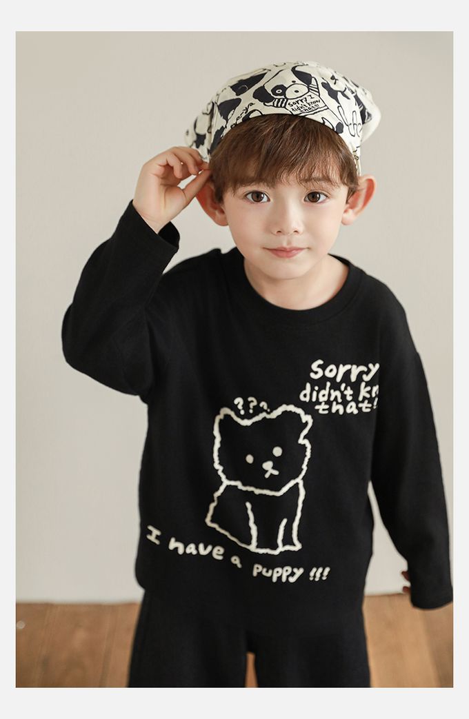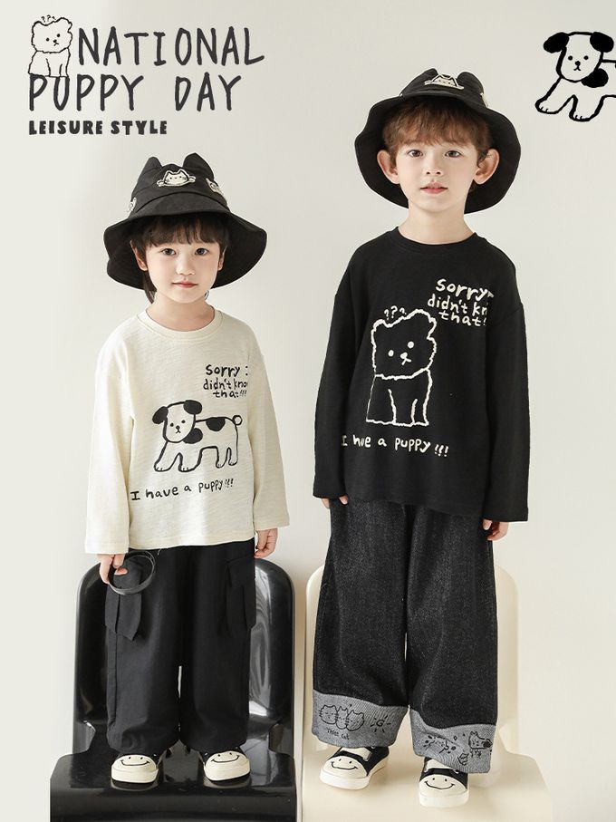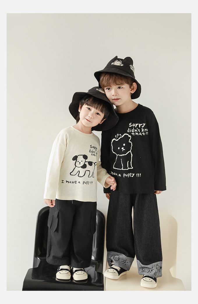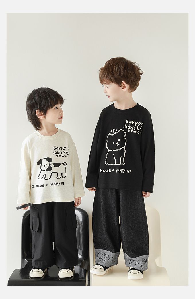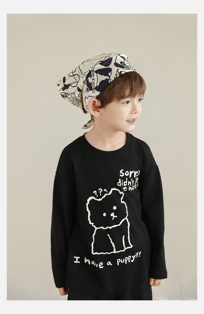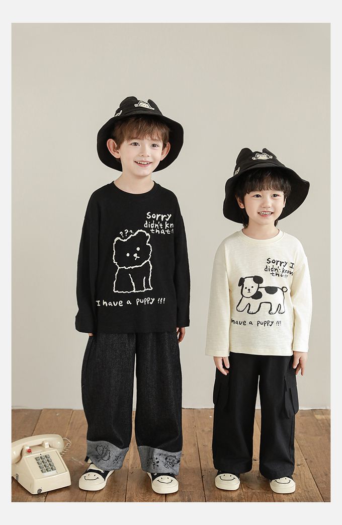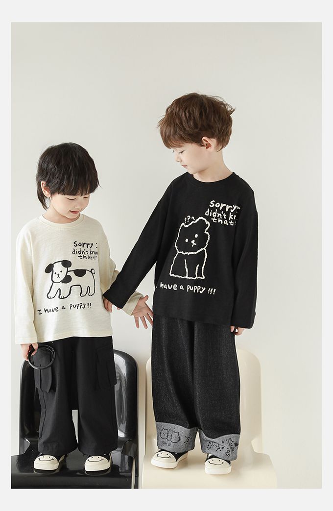純棉竹節紋圓領落肩長袖上衣-萌趣狗狗-米色