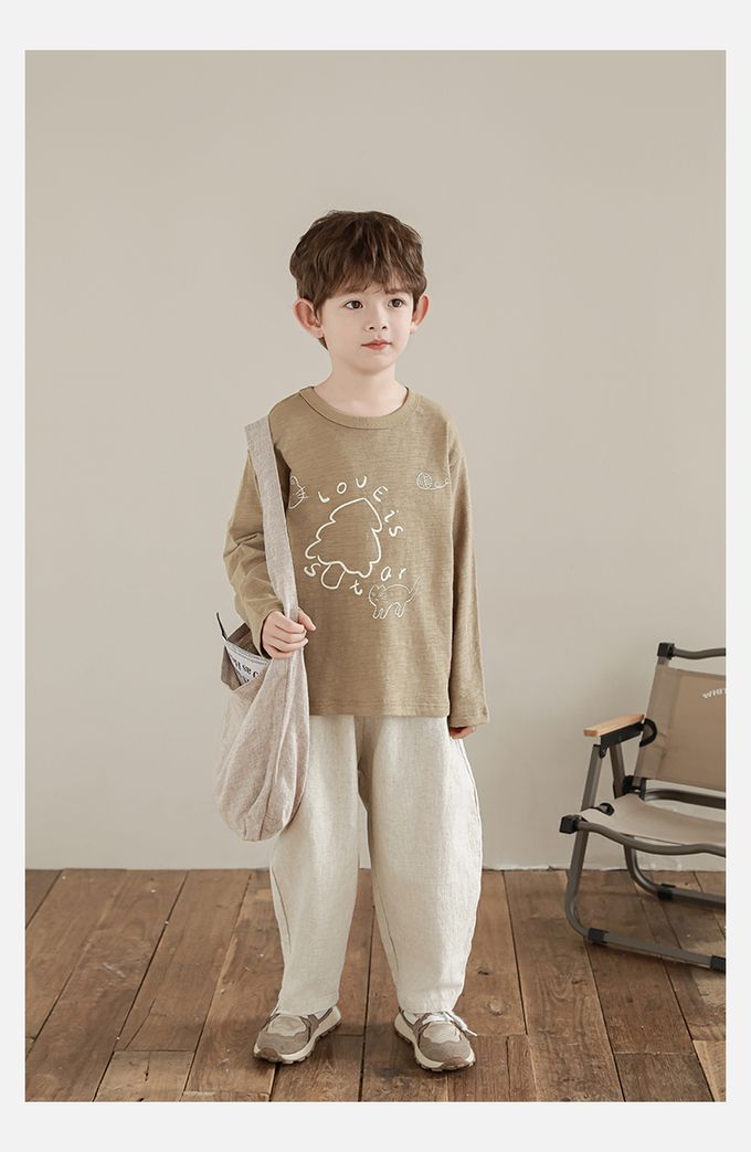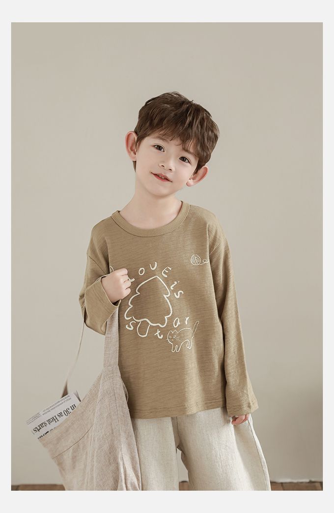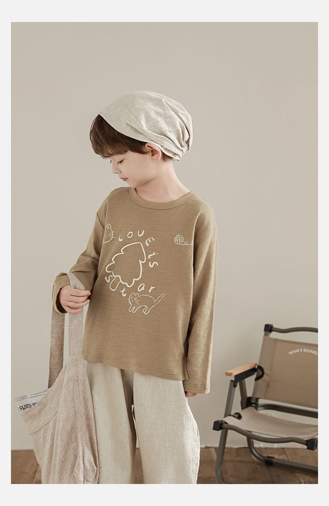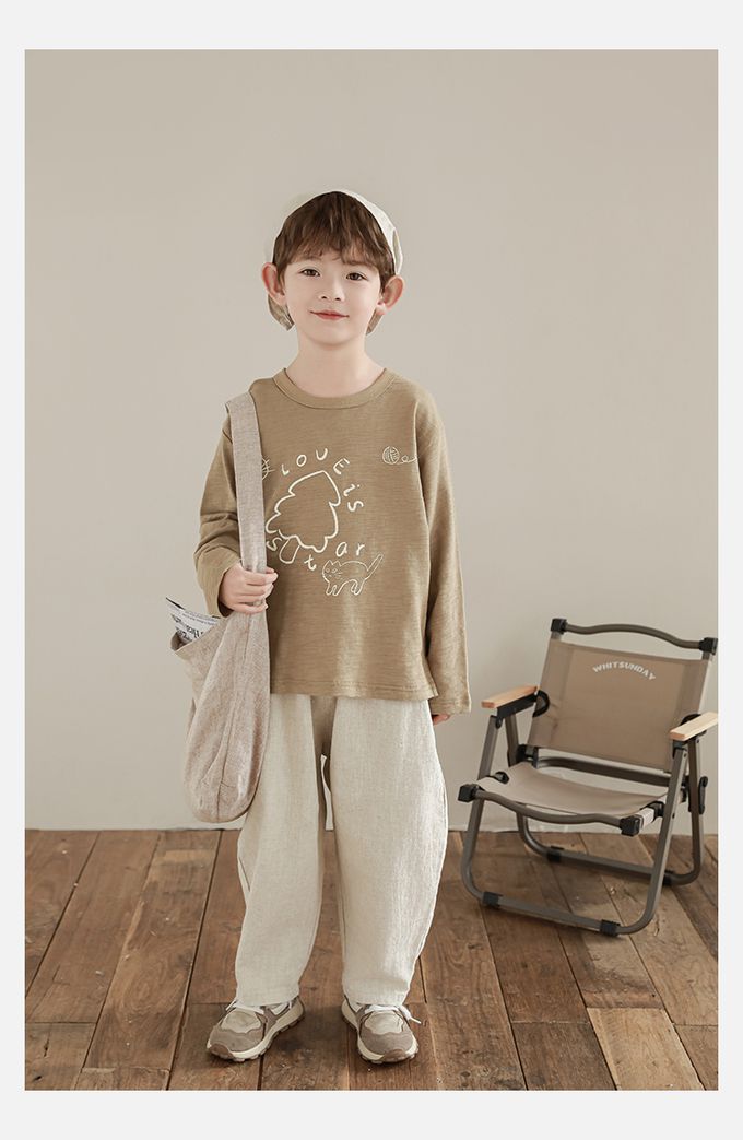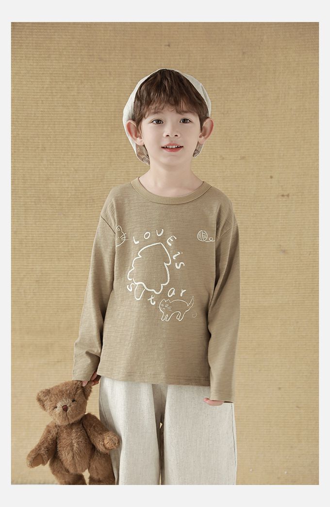 純棉竹節紋圓領落肩長袖上衣-繪畫印花-卡其