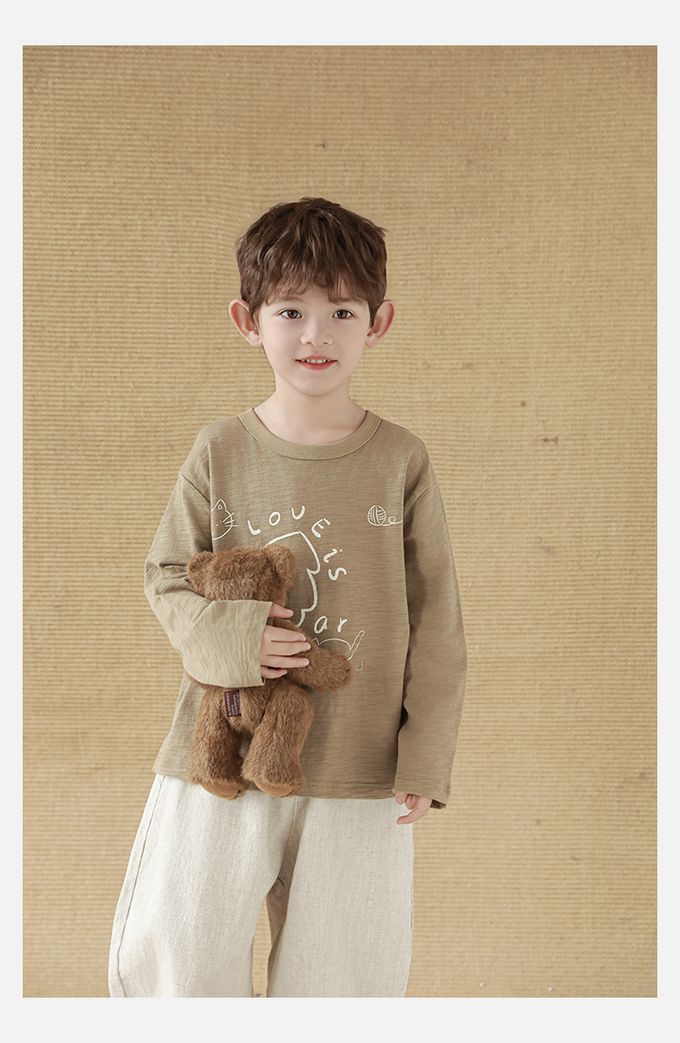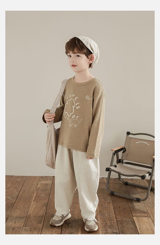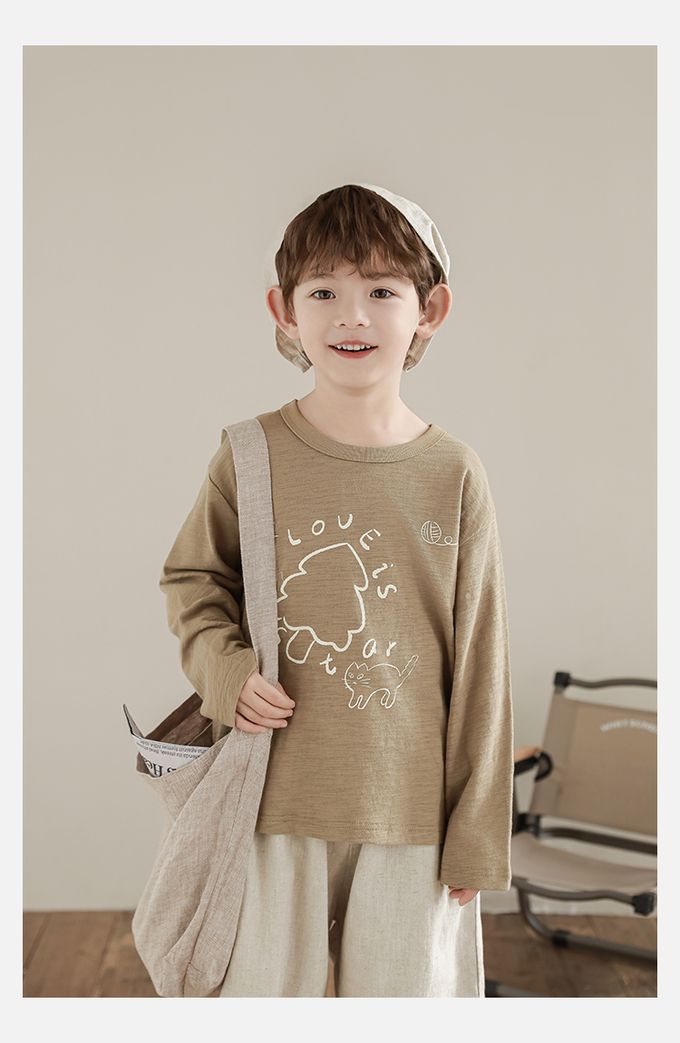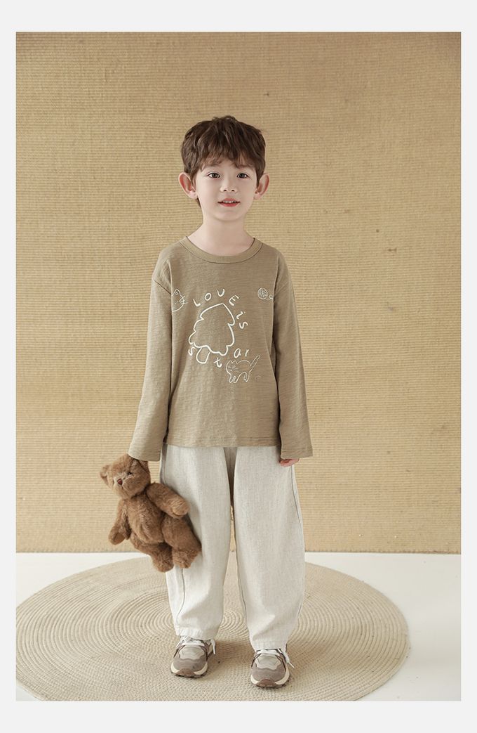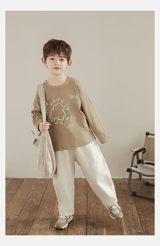 純棉竹節紋圓領落肩長袖上衣-繪畫印花-卡其