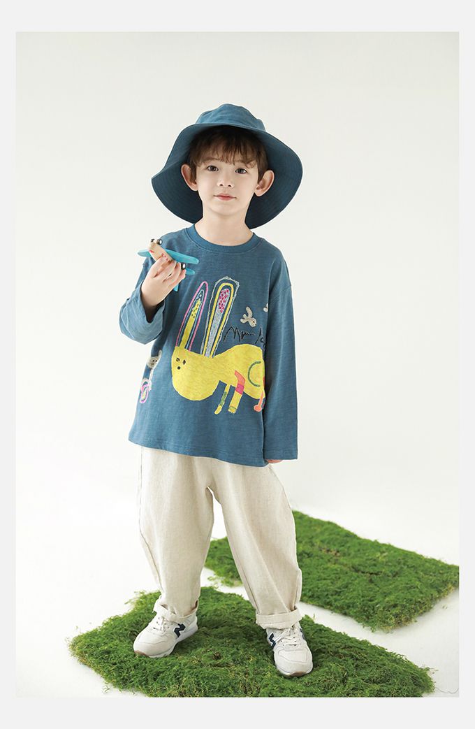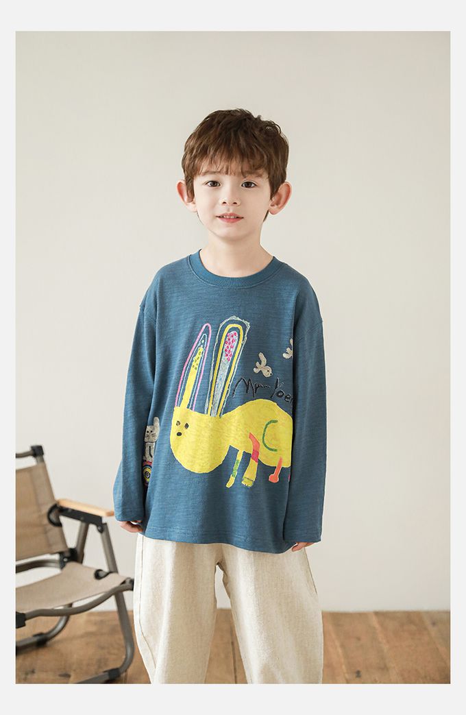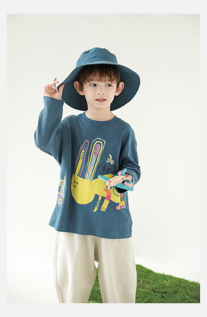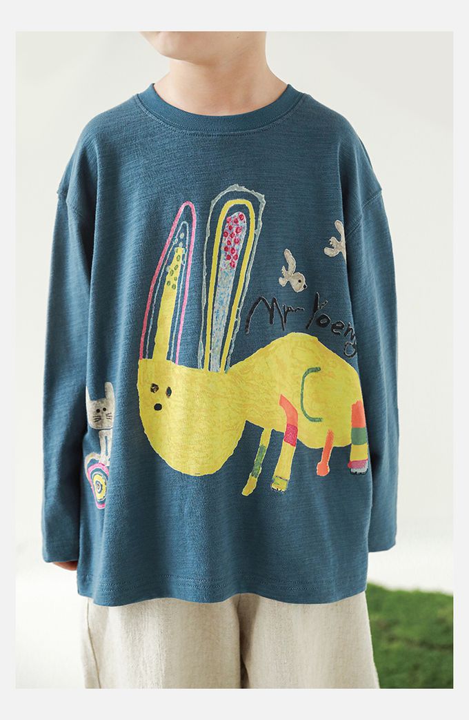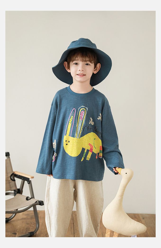純棉竹節紋圓領落肩長袖上衣-抽象塗鴉-藍色