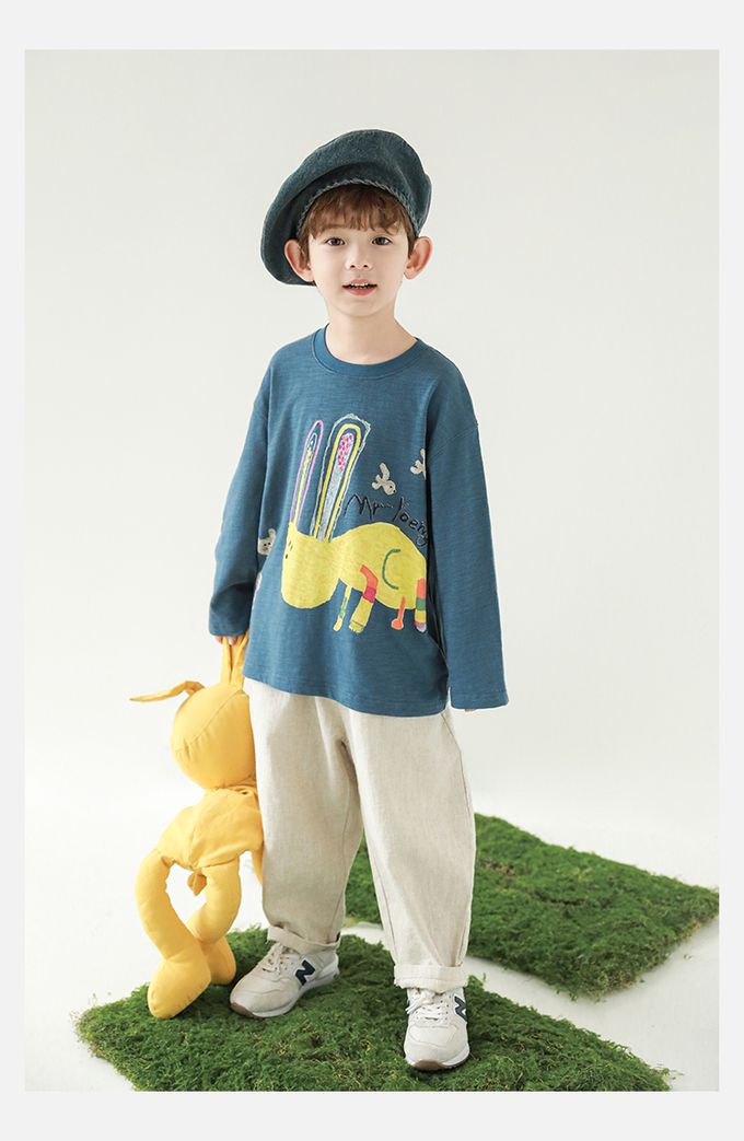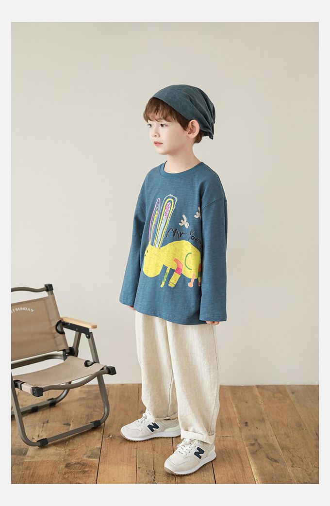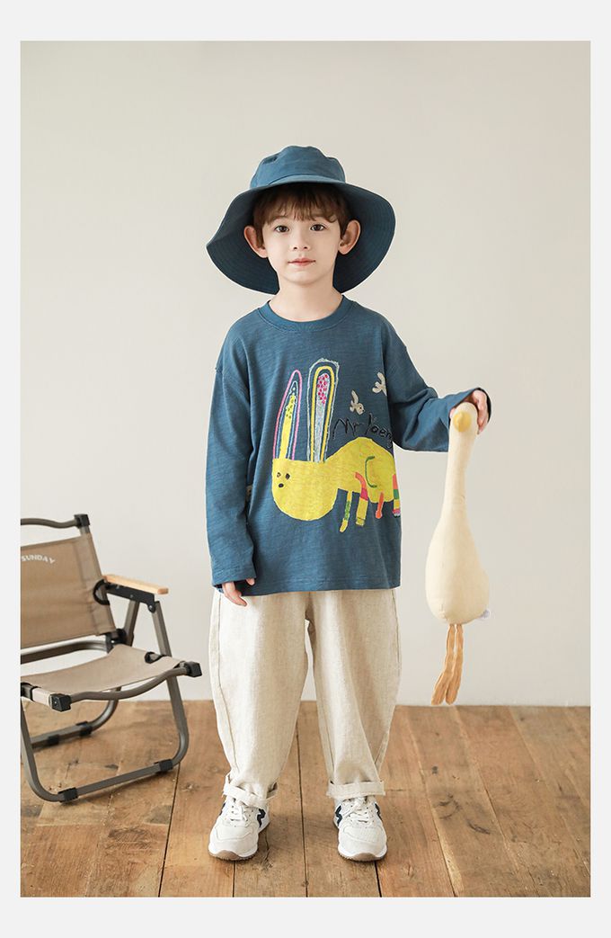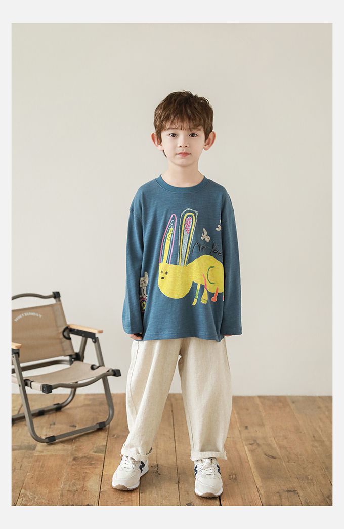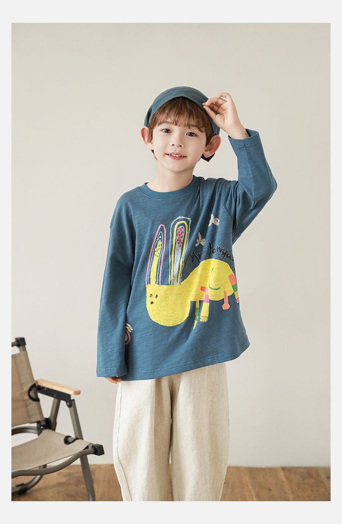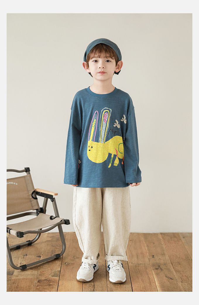 純棉竹節紋圓領落肩長袖上衣-抽象塗鴉-藍色