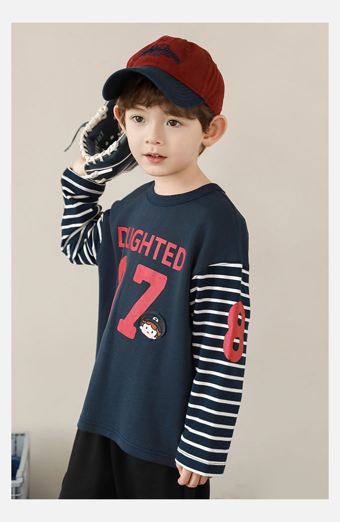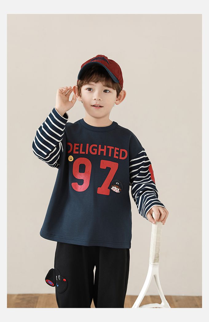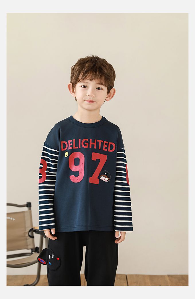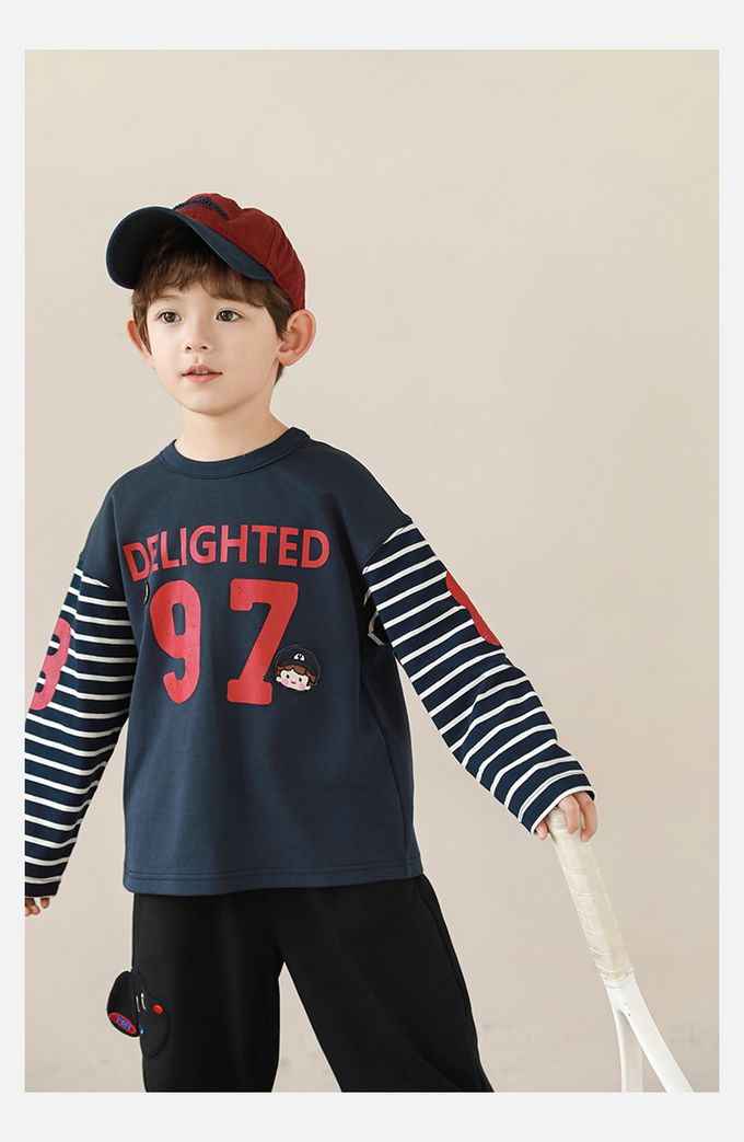純棉圓領落肩長袖上衣-運動風97-條紋藏青
