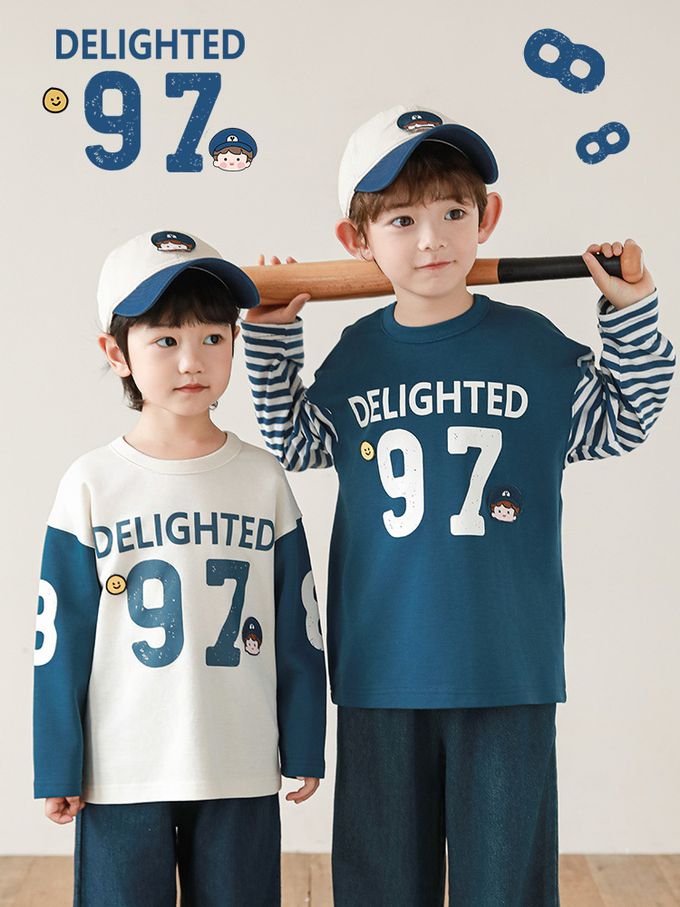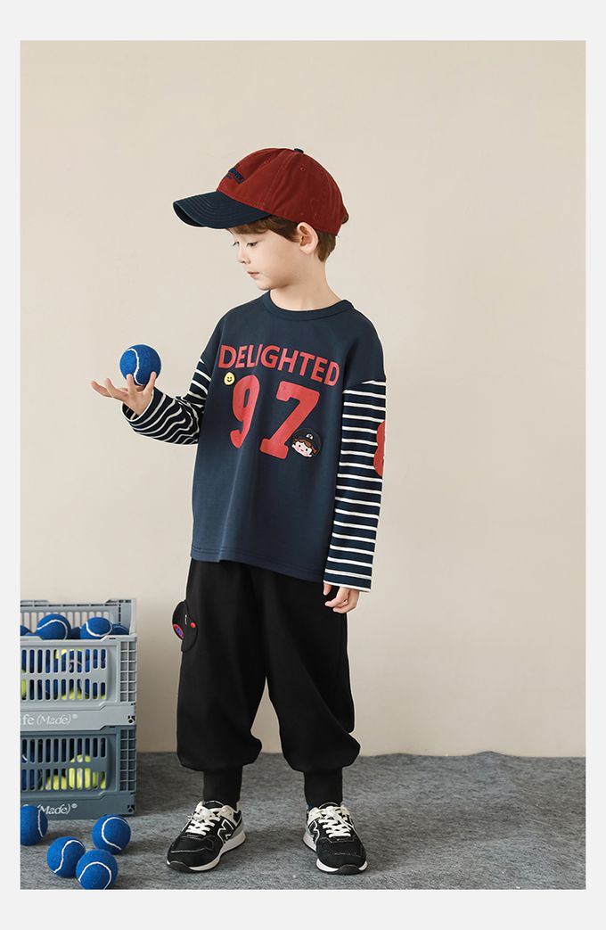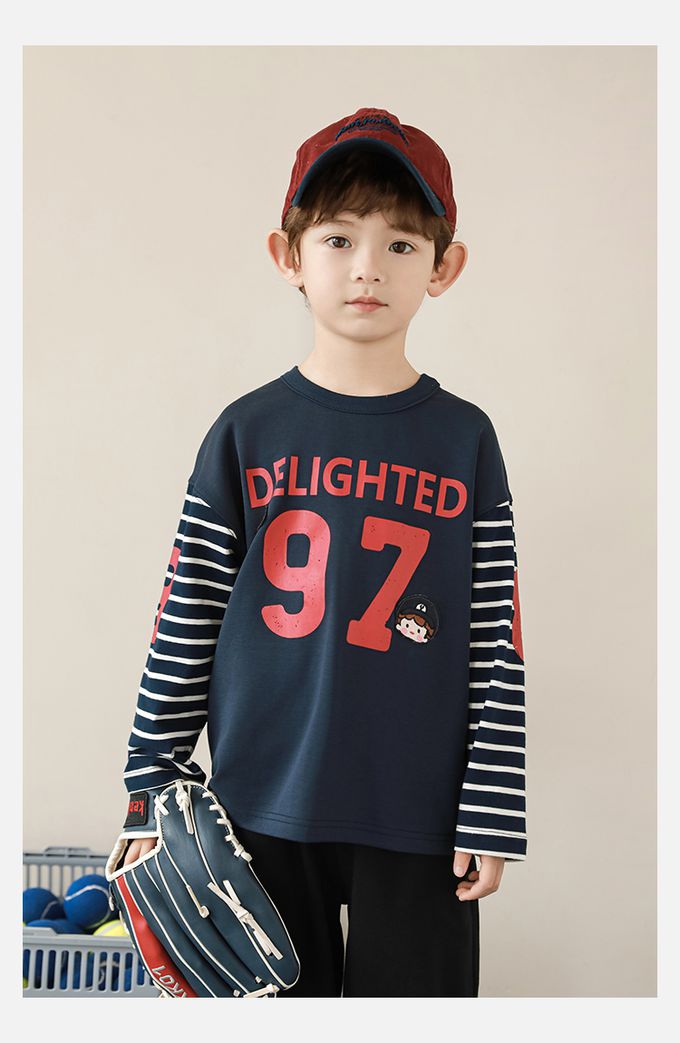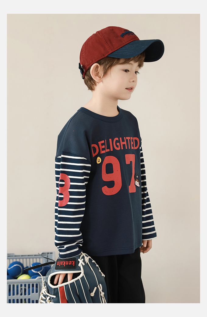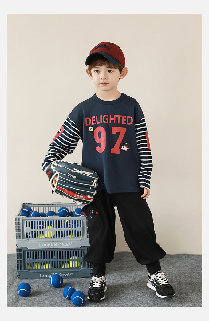 純棉圓領落肩長袖上衣-運動風97-條紋藏青