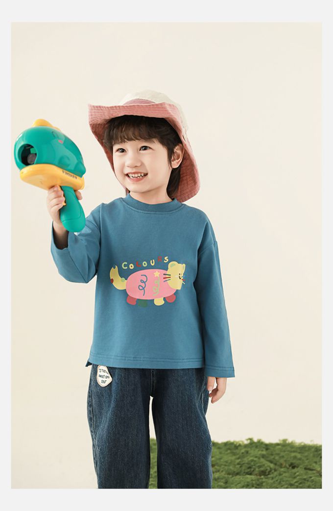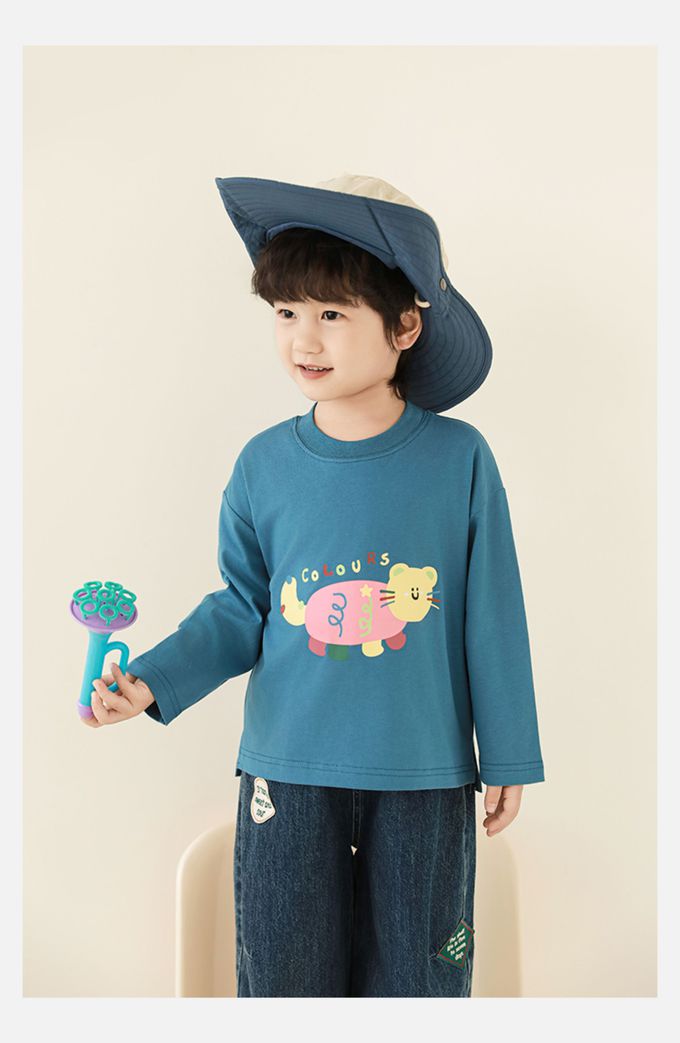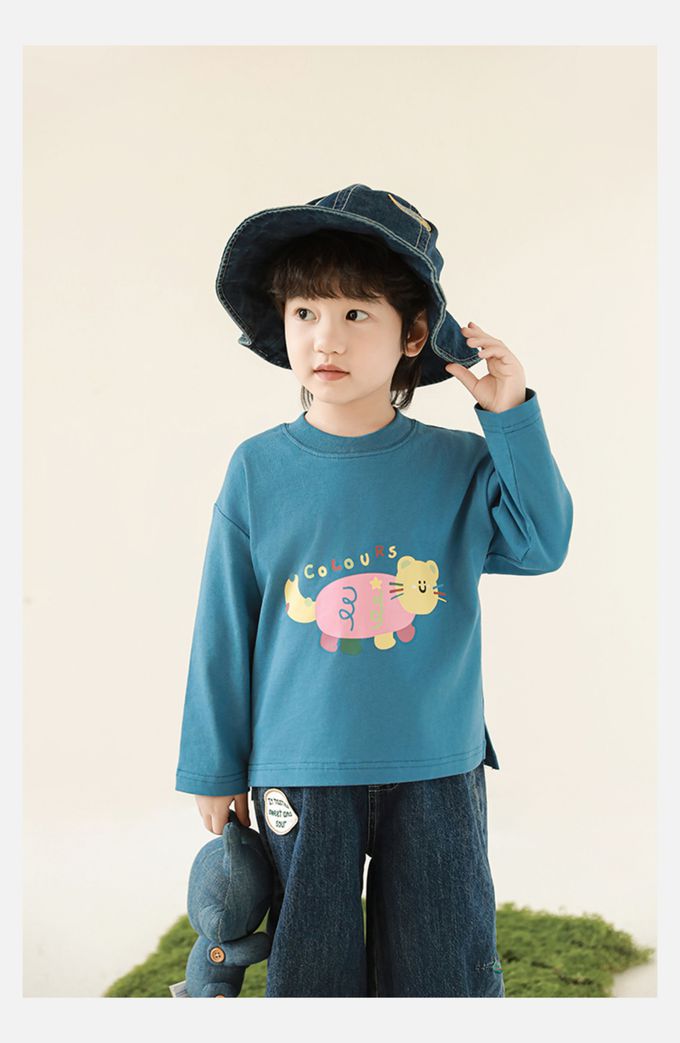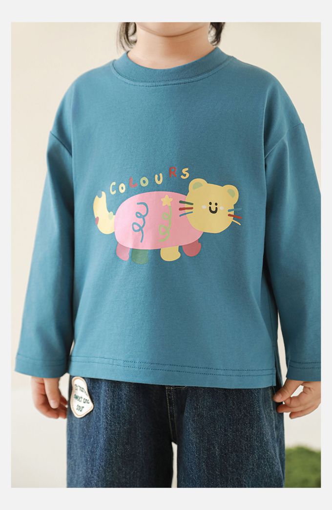 純棉圓領落肩長袖上衣-彩色小動物-藍色