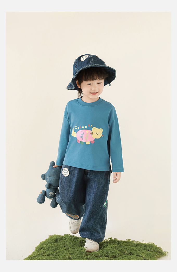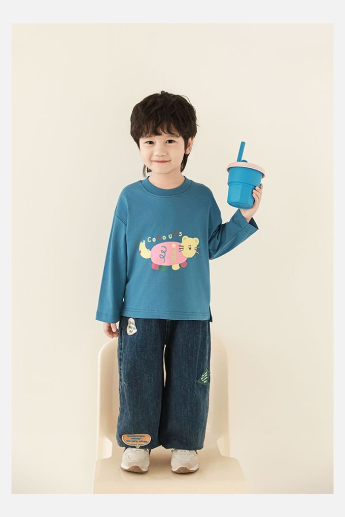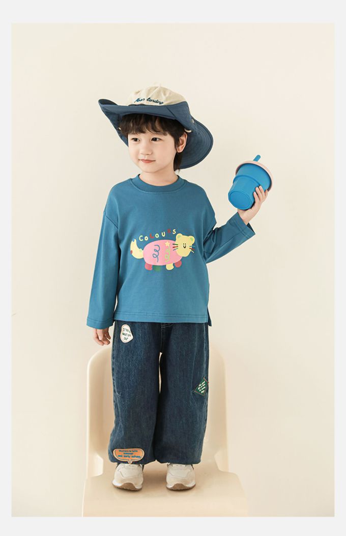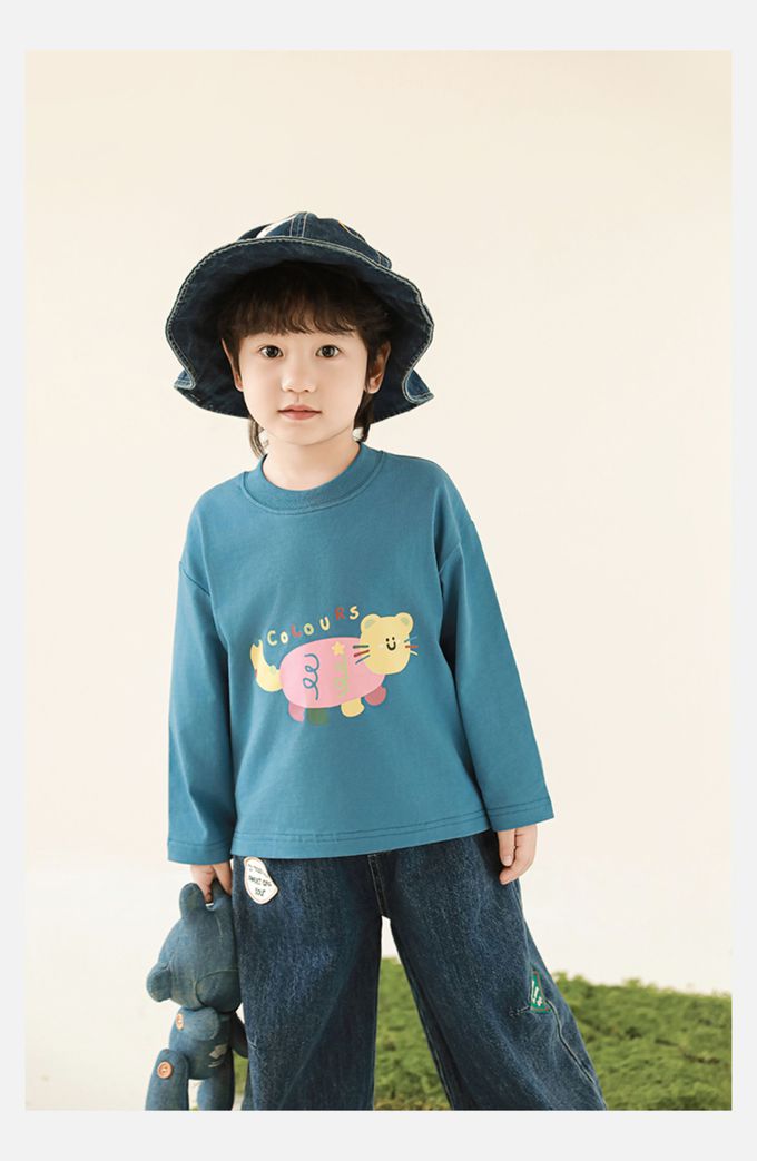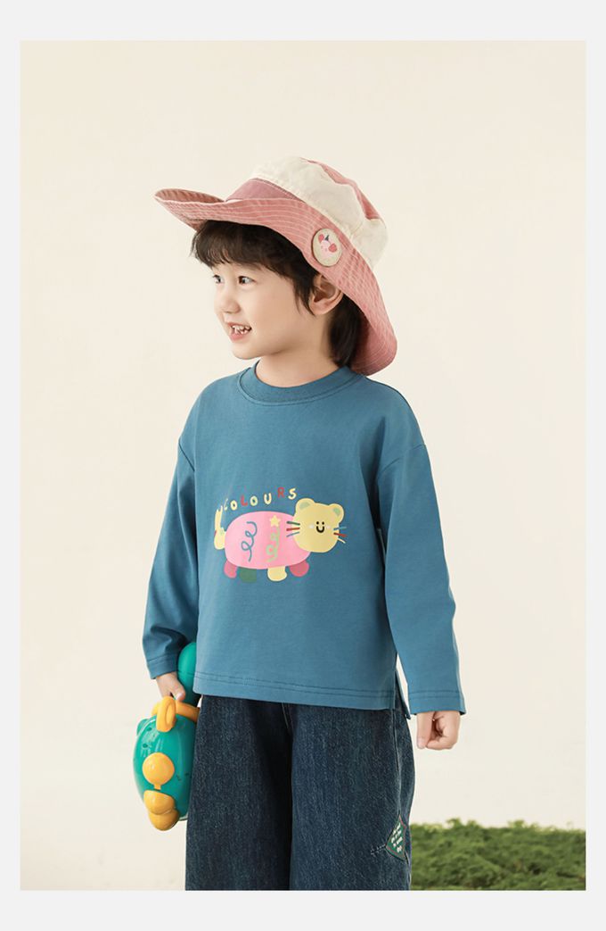 純棉圓領落肩長袖上衣-彩色小動物-藍色