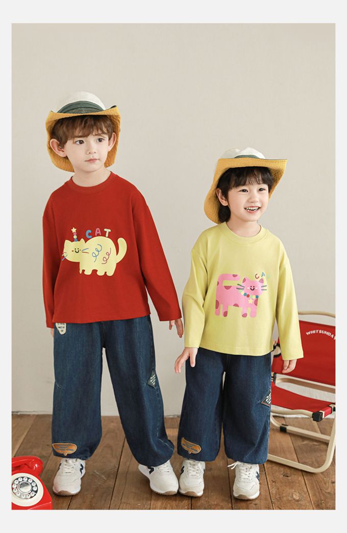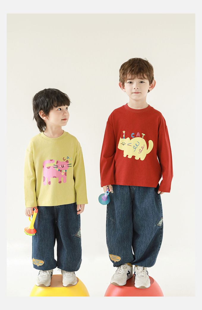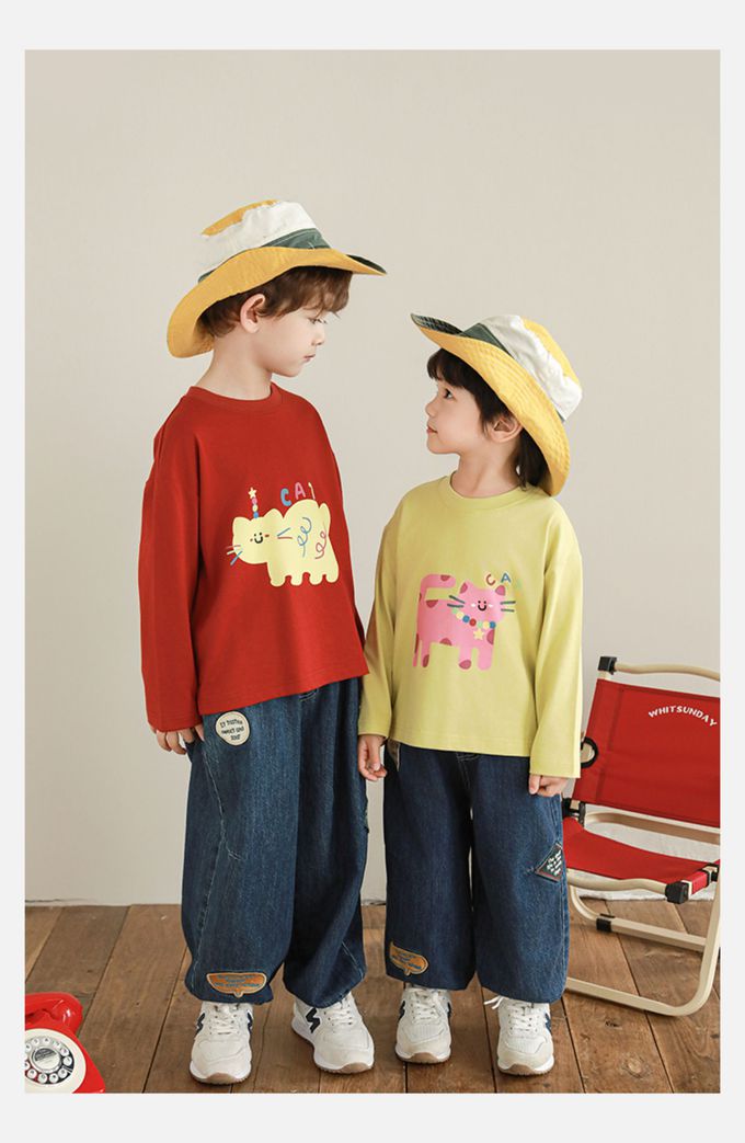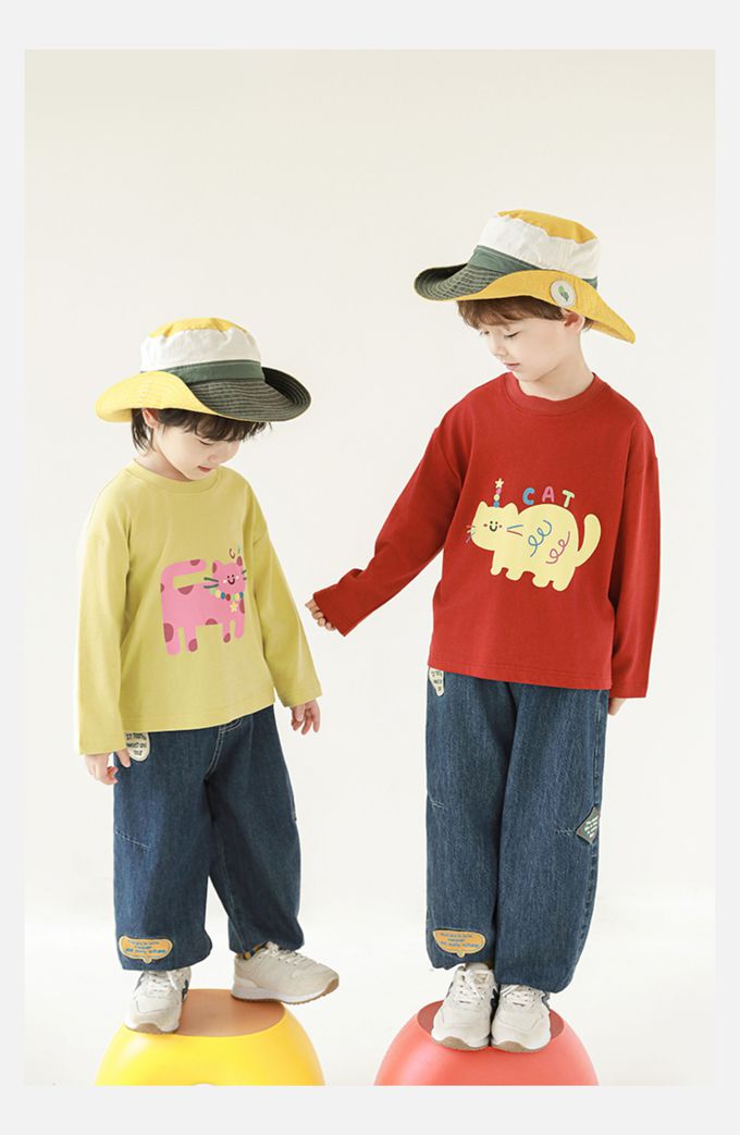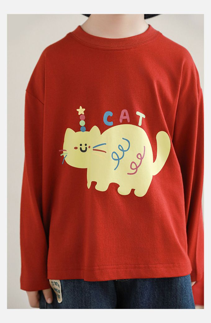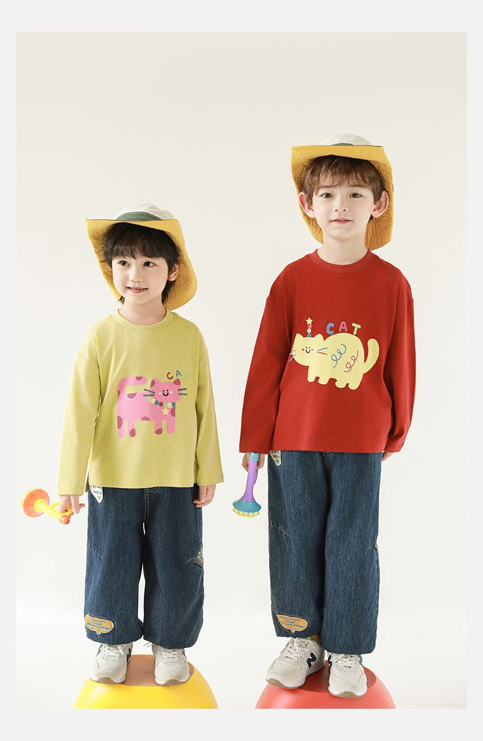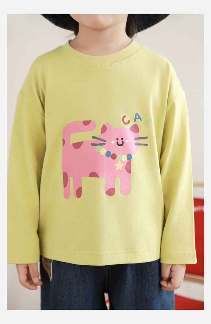 純棉圓領落肩長袖上衣-粉粉貓咪-黃色