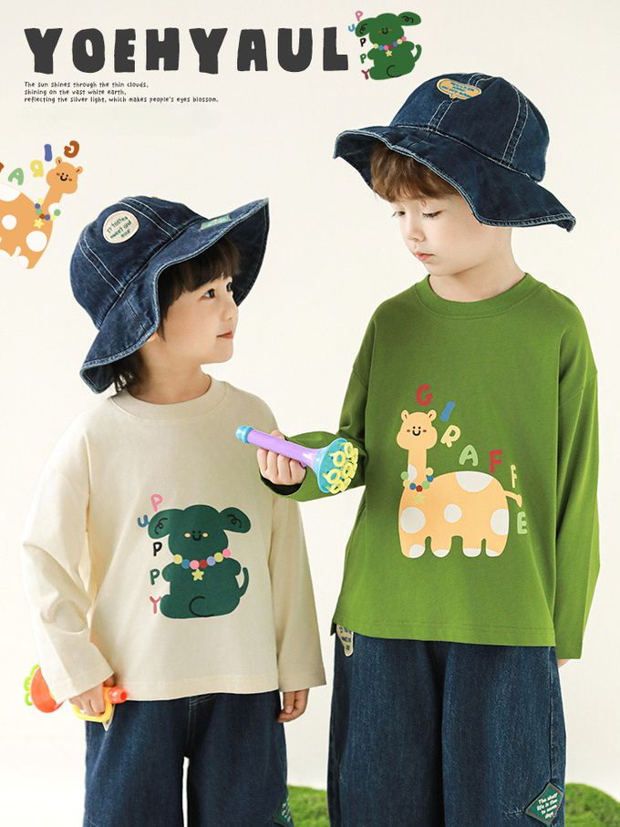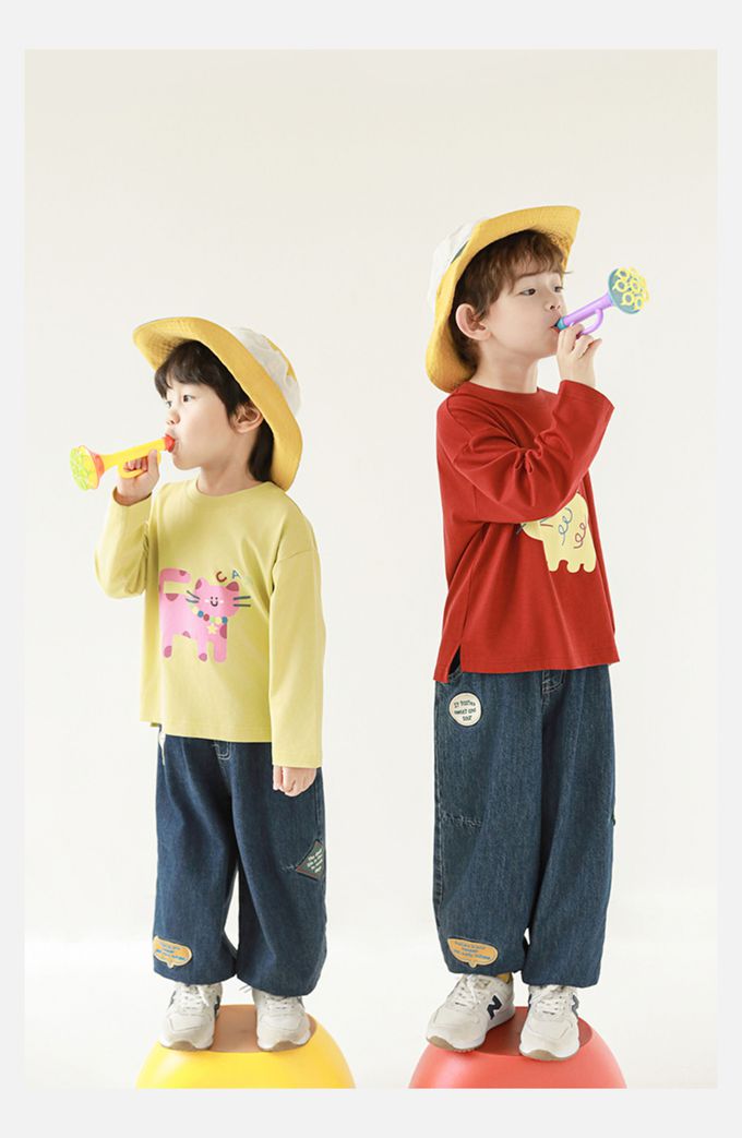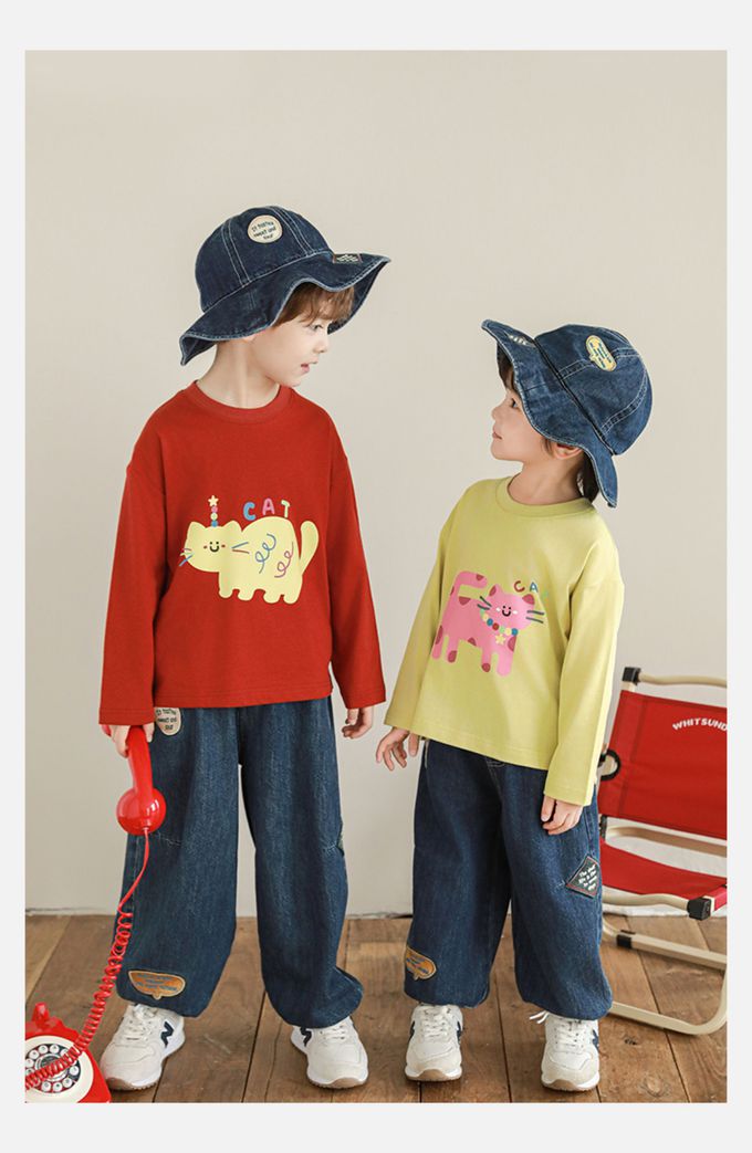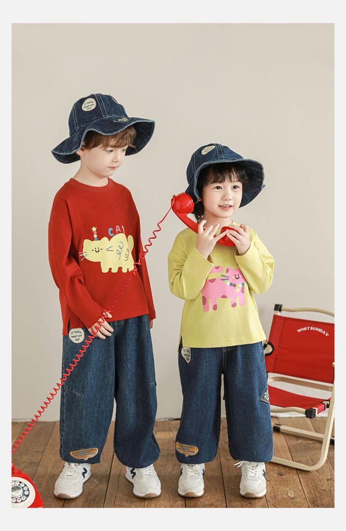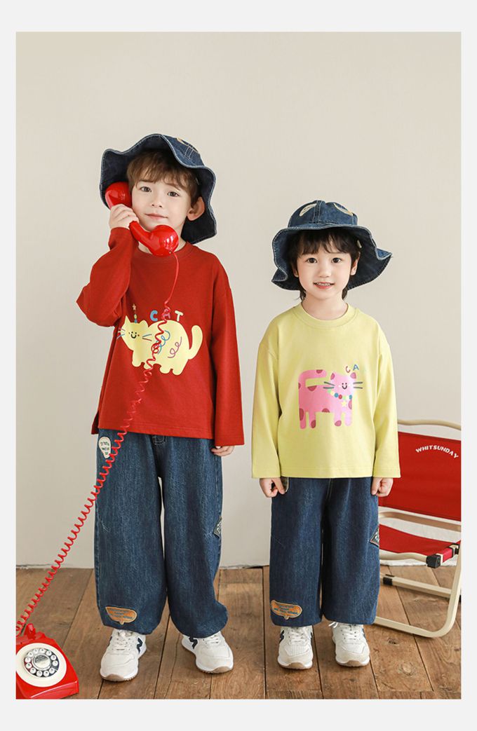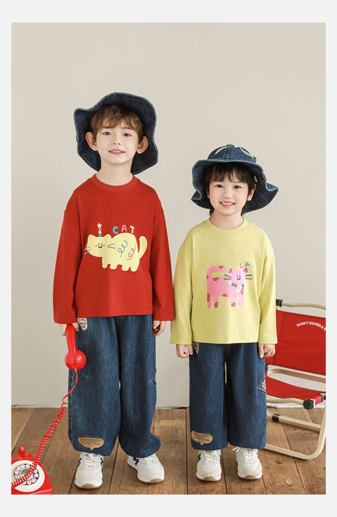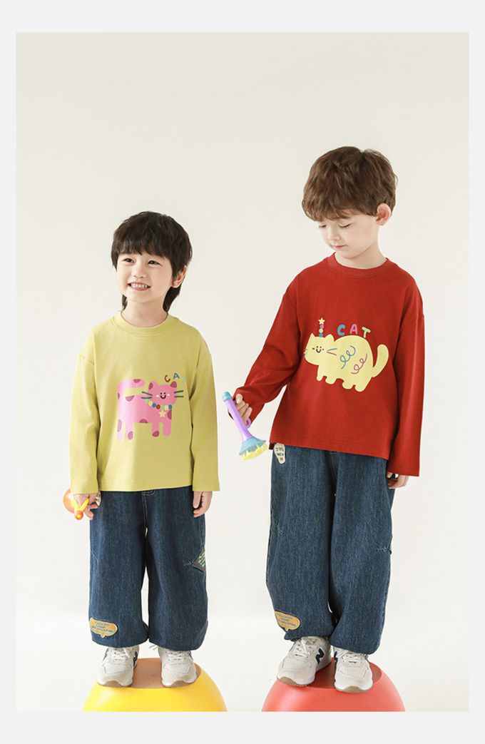 純棉圓領落肩長袖上衣-粉粉貓咪-黃色